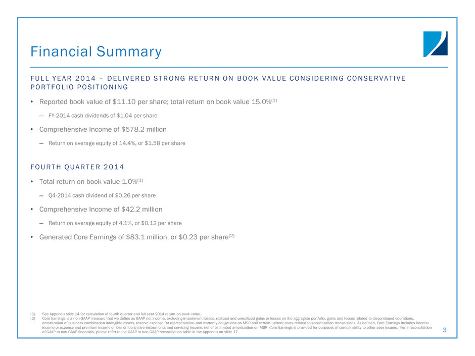 Safe Harbor Statement F O R W A R D - L O O K I N G S T A T E M EN T S This presentation includes “forward-looking statements” within the meaning of the safe harbor provisions of the United States Private Securities Litigation Reform Act of 1995. Actual results may differ from expectations, estimates and projections and, consequently, readers should not rely on these forward-looking statements as predictions of future events. Words such as “expect,” “target,” “assume,” “estimate,” “project,” “budget,” “forecast,” “anticipate,” “intend,” “plan,” “may,” “will,” “could,” “should,” “believe,” “predicts,” “potential,” “continue,” and similar expressions are intended to identify such forward-looking statements. These forward- looking statements involve significant risks and uncertainties that could cause actual results to differ materially from expected results, including, among other things, those described in our Annual Report on Form 10-K for the year ended December 31, 2013, and any subsequent Quarterly Reports on form 10-Q, under the caption “Risk Factors.” Factors that could cause actual results to differ include, but are not limited to, higher than expected operating costs, changes in prepayment speeds of mortgages underlying our residential mortgage-backed securities (RMBS), the rates of default or decreased recovery on the mortgages underlying our non-Agency securities, failure to recover credit losses in our portfolio, changes in interest rates and the market value of our assets, the availability of financing, the availability of target assets at attractive prices, our ability to manage various operational risks associated with our business, our ability to maintain our REIT qualification, limitations imposed on our business due to our REIT status and our exempt status under the Investment Company Act of 1940, the impact of new legislation or regulatory changes on our operations, the impact of any deficiencies in the servicing or foreclosure practices of third parties and related delays in the foreclosure process, our ability to acquire mortgage loans or securitize the mortgage loans we acquire, our involvement in securitization transactions, the timing and profitability of our securitization transactions, the risks associated with our securitization transactions, our ability to acquire mortgage servicing rights, the impact of new or modified government mortgage refinance or principal reduction programs, unanticipated changes in overall market and economic conditions, and our exposure to claims and litigation, including litigation arising from our involvement in securitization transactions and investments in mortgage servicing rights. Readers are cautioned not to place undue reliance upon any forward-looking statements, which speak only as of the date made. Two Harbors does not undertake or accept any obligation to release publicly any updates or revisions to any forward-looking statement to reflect any change in its expectations or any change in events, conditions or circumstances on which any such statement is based. Additional information concerning these and other risk factors is contained in Two Harbors’ most recent filings with the Securities and Exchange Commission (SEC). All subsequent written and oral forward-looking statements concerning Two Harbors or matters attributable to Two Harbors or any person acting on its behalf are expressly qualified in their entirety by the cautionary statements above. This presentation may include industry and market data obtained through research, surveys, and studies conducted by third parties and industry publications. We have not independently verified any such market and industry data from third-party sources. This presentation is provided for discussion purposes only and may not be relied upon as legal or investment advice, nor is it intended to be inclusive of all the risks and uncertainties that should be considered. This presentation does not constitute an offer to purchase or sell any securities, nor shall it be construed to be indicative of the terms of an offer that the parties or their respective affiliates would accept. Readers are advised that the financial information in this presentation is based on company data available at the time of this presentation and, in certain circumstances, may not have been audited by the company’s independent auditors. 2