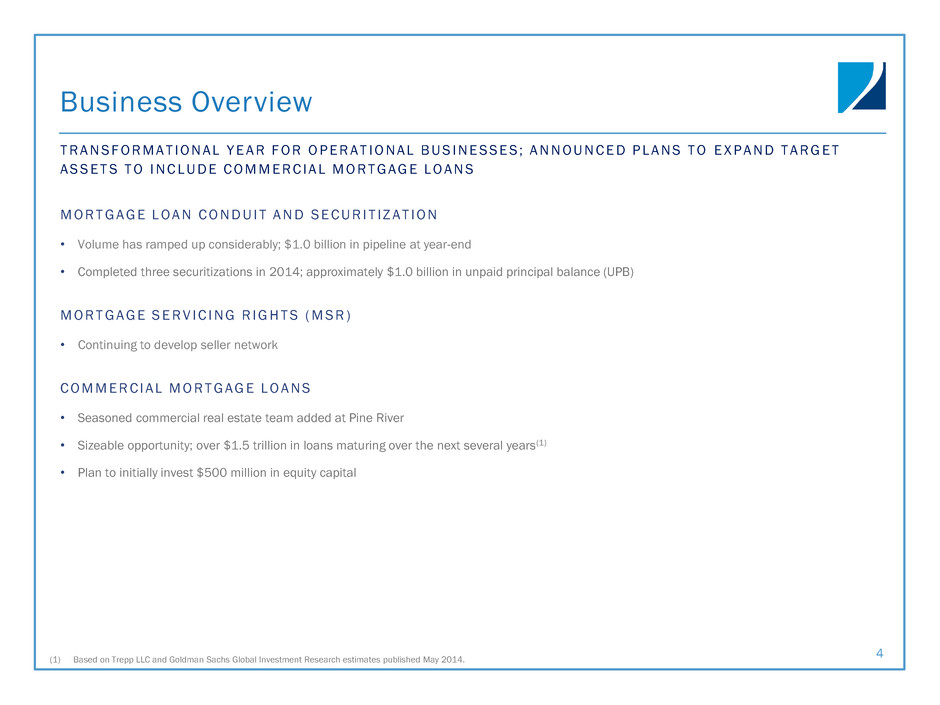 Financial Summary F U L L Y E A R 2 0 1 4 – D E L I VE R ED S T R O N G R E T U R N O N B O O K V A L U E C O N S I D E R I N G C O N S E R V A T I VE P O R T F O L I O P O S I T I O N I N G • Reported book value of $11.10 per share; total return on book value 15.0%(1) — FY-2014 cash dividends of $1.04 per share • Comprehensive Income of $578.2 million — Return on average equity of 14.4%, or $1.58 per share F O U R T H Q U A R T E R 2 0 1 4 • Total return on book value 1.0%(1) — Q4-2014 cash dividend of $0.26 per share • Comprehensive Income of $42.2 million — Return on average equity of 4.1%, or $0.12 per share • Generated Core Earnings of $83.1 million, or $0.23 per share(2) 3 (1) See Appendix slide 14 for calculation of fourth quarter and full year 2014 return on book value. (2) Core Earnings is a non-GAAP measure that we define as GAAP net income, excluding impairment losses, realized and unrealized gains or losses on the aggregate portfolio, gains and losses related to discontinued operations, amortization of business combination intangible assets, reserve expense for representation and warranty obligations on MSR and certain upfront costs related to securitization transactions. As defined, Core Earnings includes interest income or expense and premium income or loss on derivative instruments and servicing income, net of estimated amortization on MSR. Core Earnings is provided for purposes of comparability to other peer issuers. For a reconciliation of GAAP to non-GAAP financials, please refer to the GAAP to non-GAAP reconciliation table in the Appendix on slide 17.