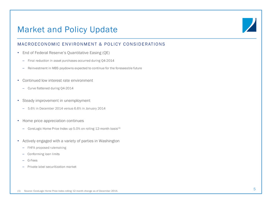 Business Overview T R A N S F O RM A T I O N A L Y E A R F O R O P E R A T I O N A L B U S I NE S S E S ; A N N O U N C E D P L A N S T O E X P A N D T A R G E T A S S E T S T O I N C L U D E C O M M E RC I A L M O R T G A G E L O A N S M O R T G A G E L O A N C O N D U I T A N D S E C U R I T I Z A T I O N • Volume has ramped up considerably; $1.0 billion in pipeline at year-end • Completed three securitizations in 2014; approximately $1.0 billion in unpaid principal balance (UPB) M O R T G A G E S E R V I C I N G R I G H T S ( M S R ) • Continuing to develop seller network C O M M E R C I A L M O R T G A G E L O A N S • Seasoned commercial real estate team added at Pine River • Sizeable opportunity; over $1.5 trillion in loans maturing over the next several years(1) • Plan to initially invest $500 million in equity capital 4 (1) Based on Trepp LLC and Goldman Sachs Global Investment Research estimates published May 2014.