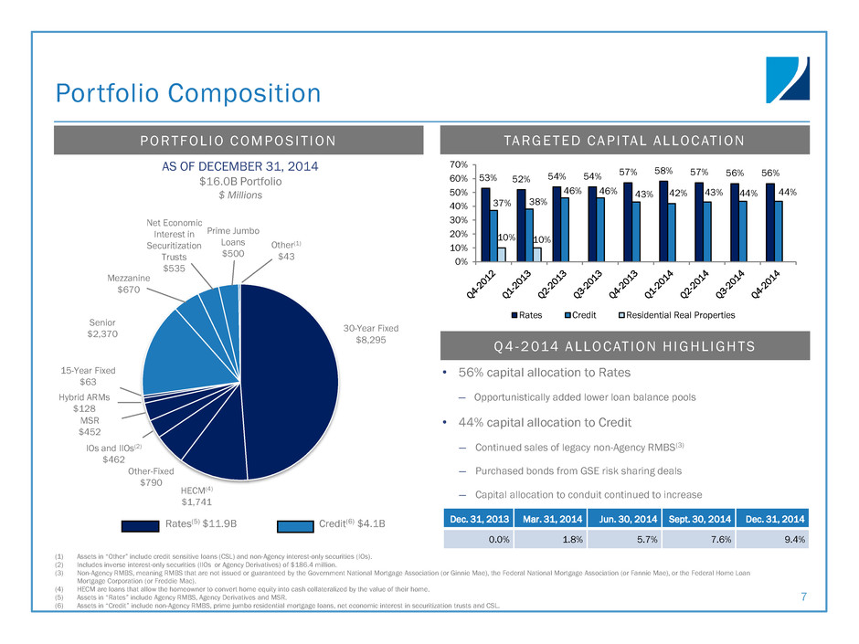 -20% 0% 20% 40% 60% 80% 100% 120% 140% TWO Pine River Mortgage REIT Index Delivering Total Return TOTA L STO C K H O L DE R R E T U R N O F 1 2 5 % S I N C E I N C E P T I O N (1 ) 6 125% (1) Two Harbors’ total stockholder return is calculated for the period October 29, 2009 through December 31, 2014. Total stockholder return is defined as stock price appreciation including dividends. Source: Bloomberg. (2) Pine River Mortgage REIT Index total stockholder return for the period October 29, 2009 through December 31, 2014. The Pine River Mortgage REIT Index tracks publicly traded REITs whose principal business consists of originating, servicing or investing in residential mortgage interests. The index uses a modified market capitalization weighted methodology, and components are reviewed quarterly for eligibility. Source: Bloomberg. 57% (2)
