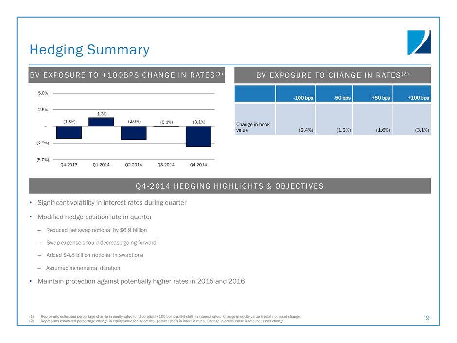 Portfolio Performance 8 Q 4 - 2 014 P E R FO R M A NC E H I G H L I G H T S (1) Assets in “Rates” include Agency RMBS, IIOs (or Agency Derivatives) and MSR. (2) Assets in “Credit” include non-Agency RMBS, prime jumbo residential mortgage loans, net economic interest in securitization trusts and CSL. (3) “Legacy” non-Agency RMBS includes non-Agency bonds issued up to and including 2009. “New issue” non-Agency RMBS includes bonds issued after 2009. (4) Agency weighted average 3-month Constant Prepayment Rate (CPR) includes IIOs (or Agency Derivatives). (5) Cost of funds includes interest spread expense associated with the portfolio's interest rate swaps. (6) Implied debt-to-equity is calculated after including net long or short TBA position. As of December 31, 2014, the net TBA position was short $1.3 billion notional. R A T E S P E R F O R M A N C E ( 1 ) • Agency yield increased 10 basis points • MSR yield of 9.1% in quarter • Agency prepays decreased modestly C R E D I T P E R F O R M A NC E ( 2 ) • Legacy non-Agency yield down 20 basis points • New issue non-Agency yield up 30 basis points; purchased higher-yielding bonds from GSE credit risk sharing deals • Yield on retained interest increased; added subs and IOs from Agate Bay Mortgage Trust 2014-3 • Non-Agency prepays stable quarter-over-quarter Portfolio Metrics Q3-2014 Q4-2014 Agency Weighted average 3-month CPR(4) 7.9% 7.5% Non-Agency Weighted average 3-month CPR 4.1% 4.2% Implied Debt-to-equity(6) 2.7x 3.0x Q 4 - 2 014 N E T I N T E R E ST Y I E L D Three Months Ended Sept. 30, 2014 Dec. 31, 2014 Annualized portfolio yield during the quarter 4.46% 4.46% Rates(1) Agency RMBS, Agency derivatives and MSR 3.6% 3.7% Credit(2) Non-Agency RMBS, legacy(3) 9.0% 8.8% Non-Agency RMBS, new issue(3) 3.4% 3.7% Net economic interest in securitization trusts 4.4% 4.7% Prime jumbo residential mortgage loans 4.1% 4.0% Credit sensitive loans (CSL) 3.4% 3.6% Annualized cost of funds on average repurchase and advance balance during the quarter(5) 1.47% 1.55% Annualized interest rate spread for aggregate portfolio during the quarter 2.99% 2.91%