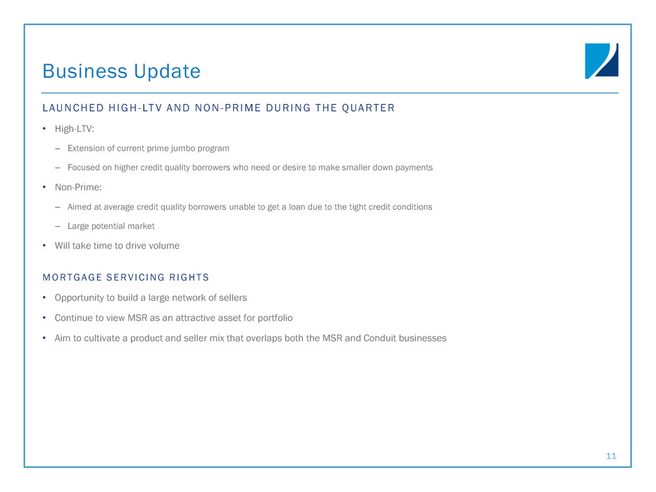 Mortgage Loan Conduit and Securitization D E V E LO P M E NT O F C O N D U IT BU S I N E S S T R A N S FO R M AT I O NAL • Completed three securitizations in 2014 totaling approximately $1.0 billion UPB • Closed Agate Bay Mortgage Trust 2015-1 in February; retained subs, IOs and AAAs • Pipeline (interest rate locks and prime jumbo holdings) strong; approximately $1.0 billion UPB at 2014 year-end – Run-rate of approximately $300 million per month • Retained interest includes AAAs of approximately $380 million and Subs and IOs of approximately $150 million • 33 sellers at year-end; focus on building additional seller relationships • FHLB financing helps provide consistent pricing to our seller partners 10 2014 PRIME JUMBO LOAN SUMMARY $4 $8 $22 $54 $138 $243 $471 $461 $296 $455 $192 $378 $268 $642 $642 $998 $998 15 16 18 19 20 21 23 25 28 30 32 33 0 5 10 15 20 25 30 35 $0 $200 $400 $600 $800 $1,000 $1,200 $1,400 Jan Feb Mar Apr May Jun Jul Aug Sep Oct Nov Dec U P B in M il lion s Settled Loans - Unsecuritized Settled Loans - Securitized Sellers