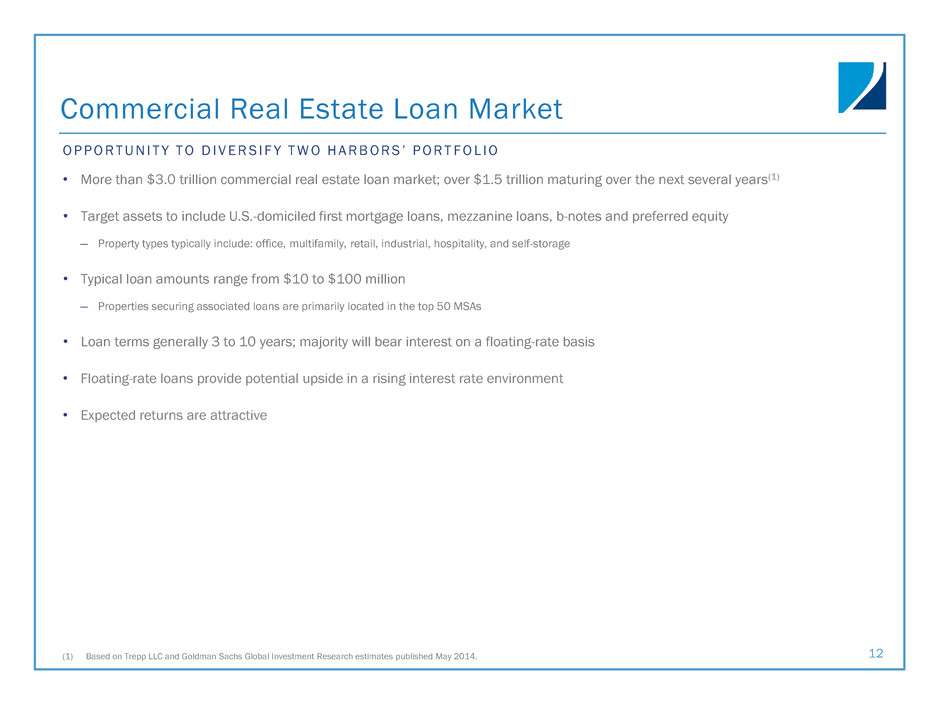 Commercial Real Estate Loan Market OPPORTUN I TY TO D I VERS IFY TWO HARBORS ’ PORTFOL IO • More than $3.0 trillion commercial real estate loan market; over $1.5 trillion maturing over the next several years(1) • Target assets to include U.S.-domiciled first mortgage loans, mezzanine loans, b-notes and preferred equity ― Property types typically include: office, multifamily, retail, industrial, hospitality, and self-storage • Typical loan amounts range from $10 to $100 million ― Properties securing associated loans are primarily located in the top 50 MSAs • Loan terms generally 3 to 10 years; majority will bear interest on a floating-rate basis • Floating-rate loans provide potential upside in a rising interest rate environment • Expected returns are attractive 12 (1) Based on Trepp LLC and Goldman Sachs Global Investment Research estimates published May 2014.