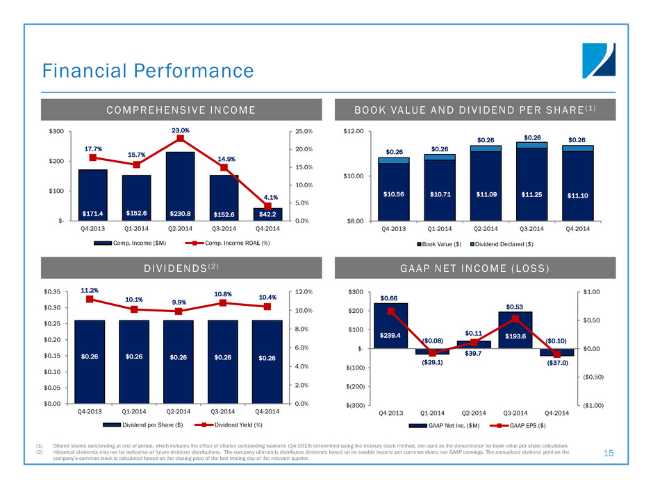 Return on Book Value 14 Return on book value Q4-2014 (Per diluted share amounts, except for percentage) Book value at September 30, 2014 $11.25 Book value at December 31, 2014 $11.10 Decrease in book value $(0.15) Dividend declared in Q4-2014 $0.26 Return on book value Q4-2014 $0.11 Return on book value Q4-2014(1) 1.0% Note: Diluted shares outstanding at end of period are used as the denominator for book value per share calculation. (1) Return on book value for quarter ended December 31, 2014 is defined as the decrease in book value per diluted share from September 30, 2014 to December 31, 2014 of $0.15, plus dividend declared of $0.26 per share, divided by September 30, 2014 diluted book value of $11.25 per share. (2) Return on book value for year-ended December 31, 2014 is defined as the increase in book value per diluted share from December 31, 2013 to December 31, 2014 of $0.54, plus dividends declared of $1.04 per share, divided by December 31, 2013 diluted book value of $10.56 per share. Return on book value year-end 2014 (Per diluted share amounts, except for percentage) Book value at December 31, 2013 $10.56 Book value at December 31, 2014 $11.10 Increase in book value $0.54 Dividend declared in FY-2014 $1.04 Return on book value FY-2014 $1.58 Return on book value FY-2014(2) 15.0%