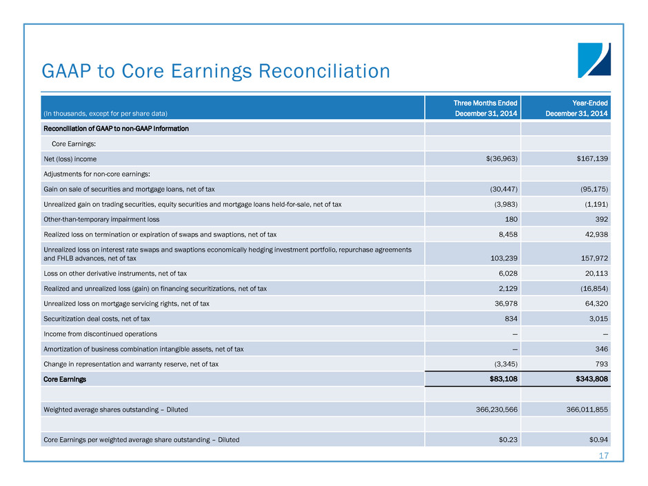 GAAP to Core Earnings Reconciliation 17 (In thousands, except for per share data) Three Months Ended December 31, 2014 Year-Ended December 31, 2014 Reconciliation of GAAP to non-GAAP Information Core Earnings: Net (loss) income $(36,963) $167,139 Adjustments for non-core earnings: Gain on sale of securities and mortgage loans, net of tax (30,447) (95,175) Unrealized gain on trading securities, equity securities and mortgage loans held-for-sale, net of tax (3,983) (1,191) Other-than-temporary impairment loss 180 392 Realized loss on termination or expiration of swaps and swaptions, net of tax 8,458 42,938 Unrealized loss on interest rate swaps and swaptions economically hedging investment portfolio, repurchase agreements and FHLB advances, net of tax 103,239 157,972 Loss on other derivative instruments, net of tax 6,028 20,113 Realized and unrealized loss (gain) on financing securitizations, net of tax 2,129 (16,854) Unrealized loss on mortgage servicing rights, net of tax 36,978 64,320 Securitization deal costs, net of tax 834 3,015 Income from discontinued operations — — Amortization of business combination intangible assets, net of tax — 346 Change in representation and warranty reserve, net of tax (3,345) 793 Core Earnings $83,108 $343,808 Weighted average shares outstanding – Diluted 366,230,566 366,011,855 Core Earnings per weighted average share outstanding – Diluted $0.23 $0.94