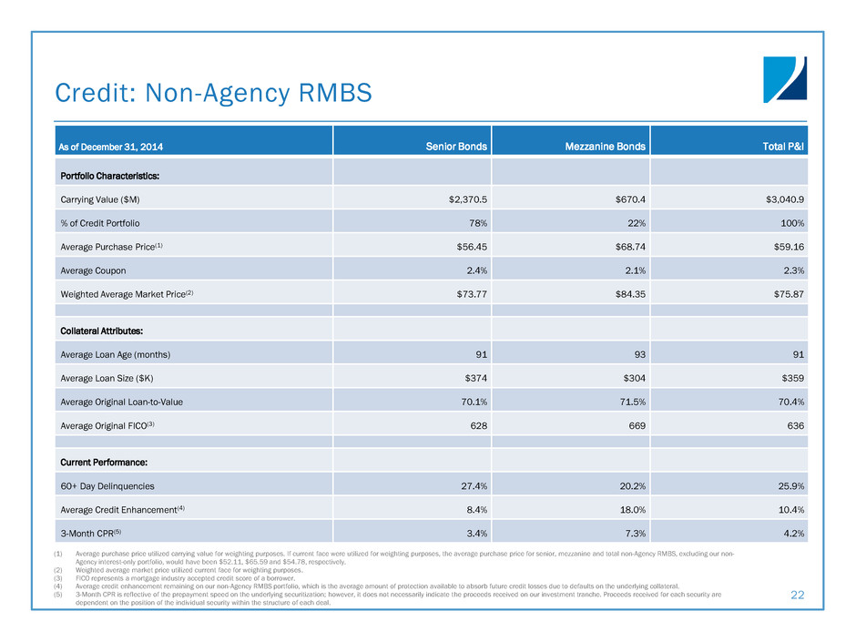 Credit: Non-Agency RMBS Metrics 21 NON-AGENCY PORTFOLIO COMPOSITION NON-AGENCY PORTFOLIO YIELDS AND METRICS (1) Weighted average cost basis includes RMBS principal and interest securities only. Average purchase price utilized carrying value for weighting purposes. If current face were utilized for weighting purposes, total non-Agency RMBS excluding the company’s non-Agency interest-only portfolio would have been $54.78 at December 31, 2014. Portfolio Yield Realized Q3-2014 At Sept. 30, 2014 Realized Q4-2014 At Dec. 31, 2014 Non-Agency yield 8.5% 8.2% 8.1% 8.1% Repo and FHLB costs 1.7% 1.7% 1.8% 1.7% Swap costs 0.8% 0.8% 0.8% 0.6% Net interest spread 6.0% 5.7% 5.5% 5.8% NON-AGENCY RMBS CPR Non-Agency: Loan Type Q3-2014 Q4-2014 Sub-Prime 77% 73% Prime 10% 13% Option-ARM 7% 7% Other 2% 4% Alt-A 4% 3% Portfolio Metrics Q3-2014 Q4-2014 Weighted average 3-month CPR 4.1% 4.2% Weighted average cost basis(1) $57.2 $59.2 3.8% 3.4% 3.6% 4.1% 4.2% 0.0% 2.0% 4.0% 6.0% 8.0% Q4-2013 Q1-2014 Q2-2014 Q3-2014 Q4-2014 Non-Agency RMBS CPR