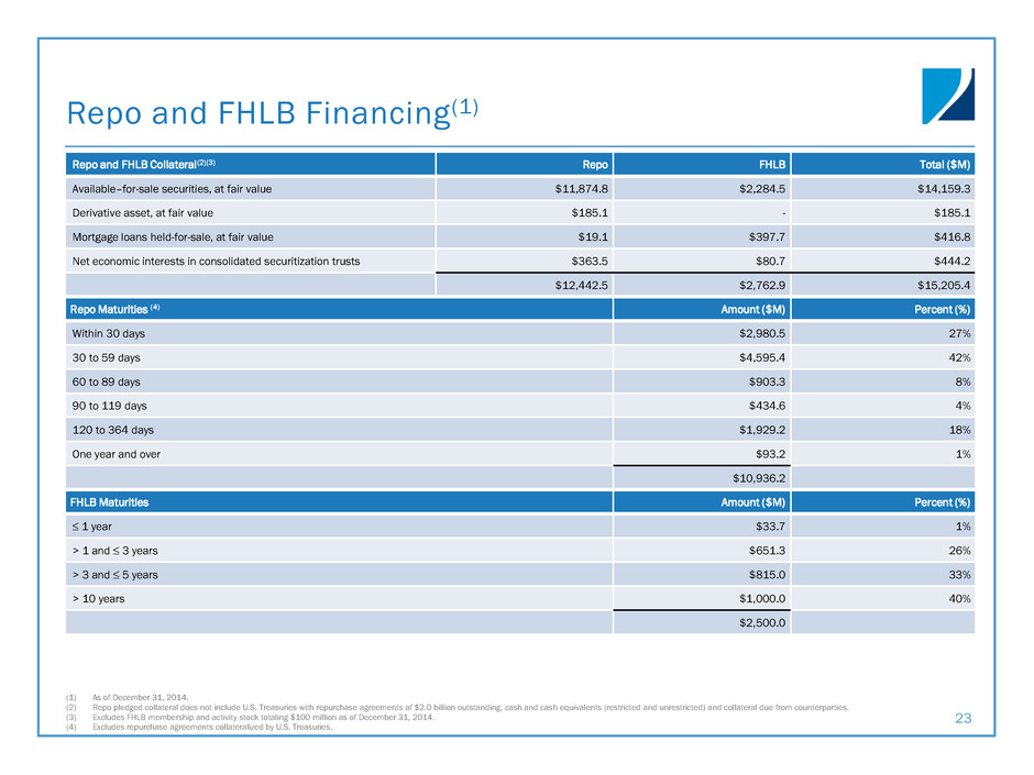 Repo and FHLB Financing(1) 23 (1) As of December 31, 2014. (2) Repo pledged collateral does not include U.S. Treasuries with repurchase agreements of $2.0 billion outstanding, cash and cash equivalents (restricted and unrestricted) and collateral due from counterparties. (3) Excludes FHLB membership and activity stock totaling $100 million as of December 31, 2014. (4) Excludes repurchase agreements collateralized by U.S. Treasuries. Repo and FHLB Collateral(2)(3) Repo FHLB Total ($M) Available–for-sale securities, at fair value $11,874.8 $2,284.5 $14,159.3 Derivative asset, at fair value $185.1 - $185.1 Mortgage loans held-for-sale, at fair value $19.1 $397.7 $416.8 Net economic interests in consolidated securitization trusts $363.5 $80.7 $444.2 $12,442.5 $2,762.9 $15,205.4 Repo Maturities (4) Amount ($M) Percent (%) Within 30 days $2,980.5 27% 30 to 59 days $4,595.4 42% 60 to 89 days $903.3 8% 90 to 119 days $434.6 4% 120 to 364 days $1,929.2 18% One year and over $93.2 1% $10,936.2 FHLB Maturities Amount ($M) Percent (%) ≤ 1 year $33.7 1% > 1 and ≤ 3 years $651.3 26% > 3 and ≤ 5 years $815.0 33% > 10 years $1,000.0 40% $2,500.0