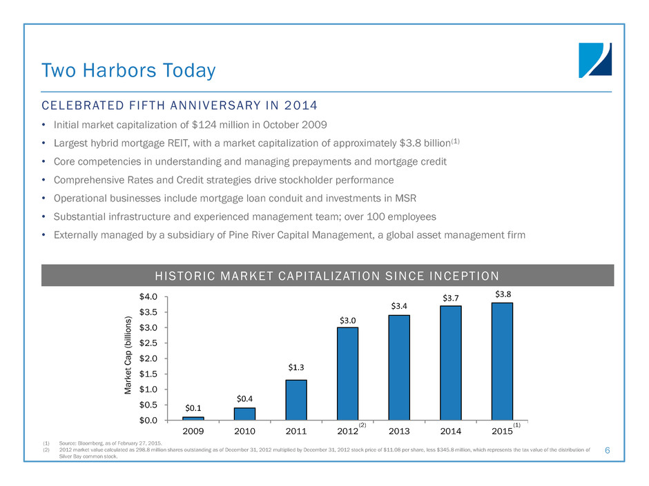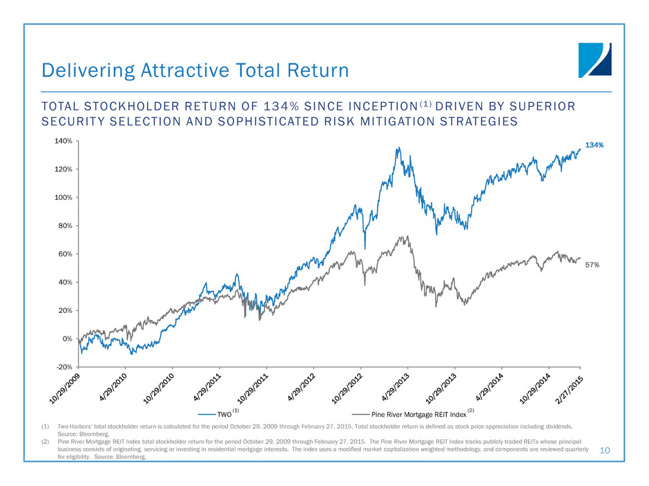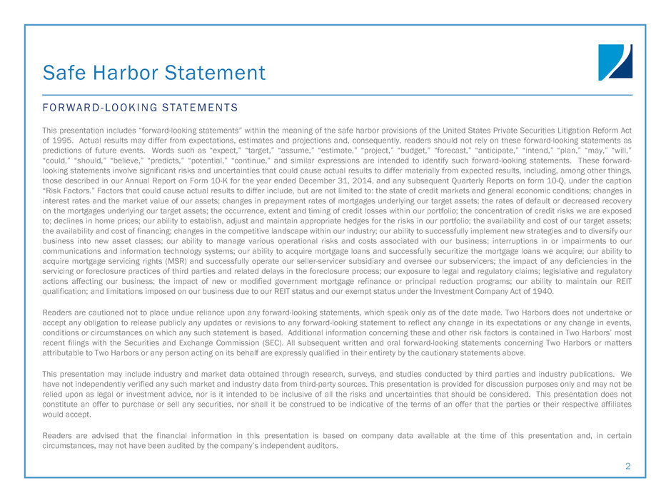Safe Harbor Statement 2 FO RWAR D - LO O KI NG STAT E M E NT S This presentation includes “forward-looking statements” within the meaning of the safe harbor provisions of the United States Private Securities Litigation Reform Act of 1995. Actual results may differ from expectations, estimates and projections and, consequently, readers should not rely on these forward-looking statements as predictions of future events. Words such as “expect,” “target,” “assume,” “estimate,” “project,” “budget,” “forecast,” “anticipate,” “intend,” “plan,” “may,” “will,” “could,” “should,” “believe,” “predicts,” “potential,” “continue,” and similar expressions are intended to identify such forward-looking statements. These forward- looking statements involve significant risks and uncertainties that could cause actual results to differ materially from expected results, including, among other things, those described in our Annual Report on Form 10-K for the year ended December 31, 2014, and any subsequent Quarterly Reports on form 10-Q, under the caption “Risk Factors.” Factors that could cause actual results to differ include, but are not limited to: the state of credit markets and general economic conditions; changes in interest rates and the market value of our assets; changes in prepayment rates of mortgages underlying our target assets; the rates of default or decreased recovery on the mortgages underlying our target assets; the occurrence, extent and timing of credit losses within our portfolio; the concentration of credit risks we are exposed to; declines in home prices; our ability to establish, adjust and maintain appropriate hedges for the risks in our portfolio; the availability and cost of our target assets; the availability and cost of financing; changes in the competitive landscape within our industry; our ability to successfully implement new strategies and to diversify our business into new asset classes; our ability to manage various operational risks and costs associated with our business; interruptions in or impairments to our communications and information technology systems; our ability to acquire mortgage loans and successfully securitize the mortgage loans we acquire; our ability to acquire mortgage servicing rights (MSR) and successfully operate our seller-servicer subsidiary and oversee our subservicers; the impact of any deficiencies in the servicing or foreclosure practices of third parties and related delays in the foreclosure process; our exposure to legal and regulatory claims; legislative and regulatory actions affecting our business; the impact of new or modified government mortgage refinance or principal reduction programs; our ability to maintain our REIT qualification; and limitations imposed on our business due to our REIT status and our exempt status under the Investment Company Act of 1940. Readers are cautioned not to place undue reliance upon any forward-looking statements, which speak only as of the date made. Two Harbors does not undertake or accept any obligation to release publicly any updates or revisions to any forward-looking statement to reflect any change in its expectations or any change in events, conditions or circumstances on which any such statement is based. Additional information concerning these and other risk factors is contained in Two Harbors’ most recent filings with the Securities and Exchange Commission (SEC). All subsequent written and oral forward-looking statements concerning Two Harbors or matters attributable to Two Harbors or any person acting on its behalf are expressly qualified in their entirety by the cautionary statements above. This presentation may include industry and market data obtained through research, surveys, and studies conducted by third parties and industry publications. We have not independently verified any such market and industry data from third-party sources. This presentation is provided for discussion purposes only and may not be relied upon as legal or investment advice, nor is it intended to be inclusive of all the risks and uncertainties that should be considered. This presentation does not constitute an offer to purchase or sell any securities, nor shall it be construed to be indicative of the terms of an offer that the parties or their respective affiliates would accept. Readers are advised that the financial information in this presentation is based on company data available at the time of this presentation and, in certain circumstances, may not have been audited by the company’s independent auditors.