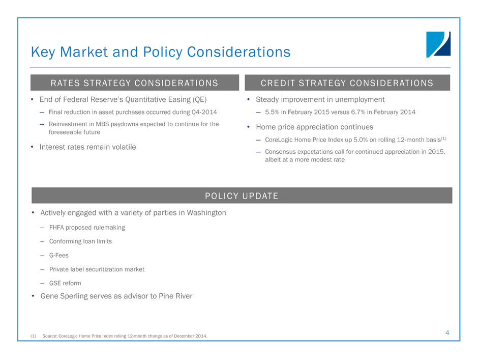 Key Market and Policy Considerations 4 RATES STRATEGY CONSIDERATIONS POLICY UPDATE • Actively engaged with a variety of parties in Washington – FHFA proposed rulemaking – Conforming loan limits – G-Fees – Private label securitization market – GSE reform • Gene Sperling serves as advisor to Pine River • End of Federal Reserve’s Quantitative Easing (QE) ― Final reduction in asset purchases occurred during Q4-2014 ― Reinvestment in MBS paydowns expected to continue for the foreseeable future • Interest rates remain volatile CREDIT STRATEGY CONSIDERATIONS • Steady improvement in unemployment ― 5.5% in February 2015 versus 6.7% in February 2014 • Home price appreciation continues ― CoreLogic Home Price Index up 5.0% on rolling 12-month basis(1) ― Consensus expectations call for continued appreciation in 2015, albeit at a more modest rate (1) Source: CoreLogic Home Price Index rolling 12-month change as of December 2014.