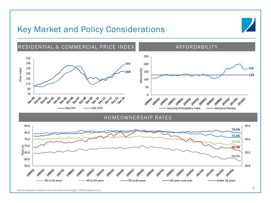 0 50 100 150 200 250 Afford a b ili ty Housing Affordability Index Historical Median Key Market and Policy Considerations 5 RESIDENTIAL & COMMERCIAL PRICE INDEX HOMEOWNERSHIP RATES AFFORDABIL IT Y 70 90 110 130 150 170 190 210 P ri ce I n de x Resi HPI CRE CPPI 185 158 30.0 35.0 40.0 45.0 55.0 60.0 65.0 70.0 75.0 80.0 85.0 R a te ( % ) 35 to 44 years 45 to 54 years 55 to 64 years 65 years and over Under 35 years 168 79.5% 75.8% 70.5% 58.8% 35.3% 129 Source: Based on research from our external manager, PRCM Advisers LLC.