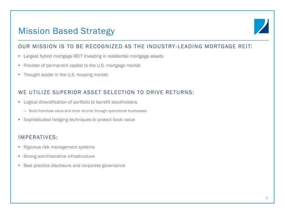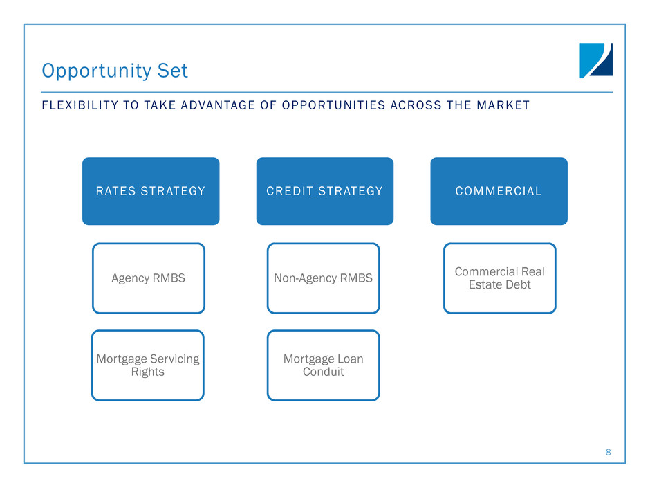 Mission Based Strategy OUR MISSION IS TO BE RECOGNIZED AS THE INDUSTRY -LEADING MORTGAGE REIT: • Largest hybrid mortgage REIT investing in residential mortgage assets • Provider of permanent capital to the U.S. mortgage market • Thought leader in the U.S. housing market WE UT IL IZE SUPERIOR ASSET SELECTION TO DRIVE RETURNS: • Logical diversification of portfolio to benefit stockholders – Build franchise value and drive returns through operational businesses • Sophisticated hedging techniques to protect book value IMPERATIVES: • Rigorous risk management systems • Strong administrative infrastructure • Best practice disclosure and corporate governance 7