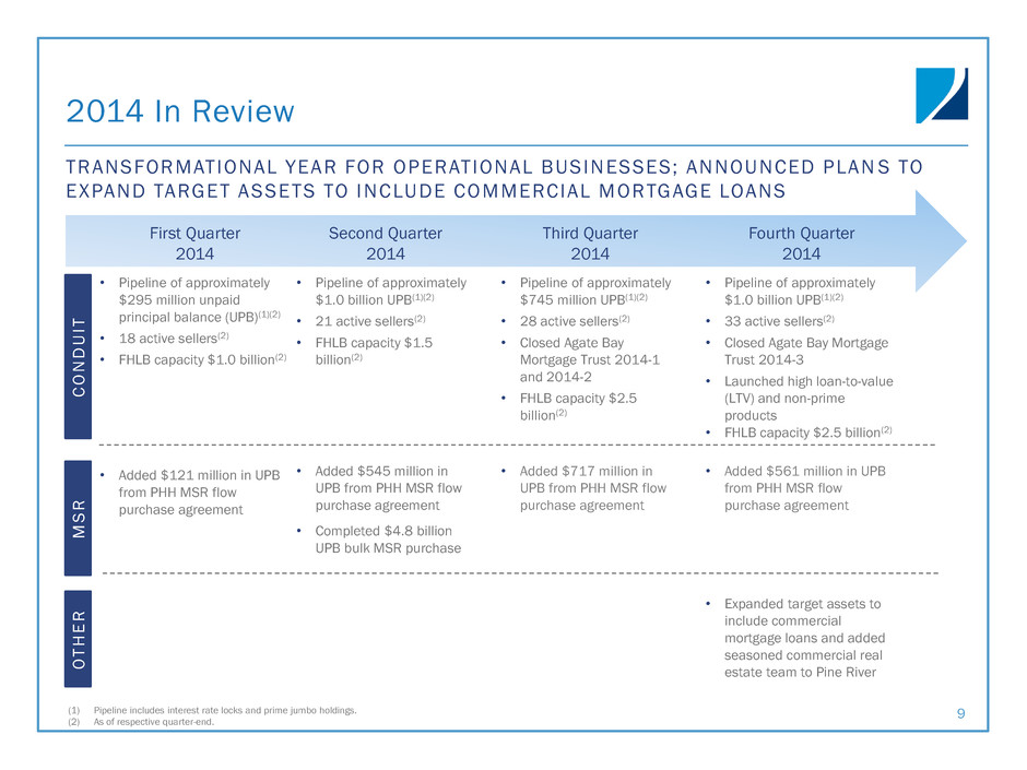 2014 In Review 9 TRANSFORMATIONAL YEAR FOR OPERATIONAL BUSINESSES; ANNOUNCED PLAN S TO EXPAND TARGET ASSETS TO INCLUDE COMMERCIAL MORTGAGE LOANS (1) Pipeline includes interest rate locks and prime jumbo holdings. (2) As of respective quarter-end. First Quarter 2014 • Pipeline of approximately $295 million unpaid principal balance (UPB)(1)(2) • 18 active sellers(2) • FHLB capacity $1.0 billion(2) • Added $121 million in UPB from PHH MSR flow purchase agreement Second Quarter 2014 • Pipeline of approximately $1.0 billion UPB(1)(2) • 21 active sellers(2) • FHLB capacity $1.5 billion(2) • Added $545 million in UPB from PHH MSR flow purchase agreement • Completed $4.8 billion UPB bulk MSR purchase Third Quarter 2014 • Pipeline of approximately $745 million UPB(1)(2) • 28 active sellers(2) • Closed Agate Bay Mortgage Trust 2014-1 and 2014-2 • FHLB capacity $2.5 billion(2) • Added $717 million in UPB from PHH MSR flow purchase agreement Fourth Quarter 2014 • Pipeline of approximately $1.0 billion UPB(1)(2) • 33 active sellers(2) • Closed Agate Bay Mortgage Trust 2014-3 • Launched high loan-to-value (LTV) and non-prime products • FHLB capacity $2.5 billion(2) • Added $561 million in UPB from PHH MSR flow purchase agreement • Expanded target assets to include commercial mortgage loans and added seasoned commercial real estate team to Pine River C O N D U IT M S R O T H E R