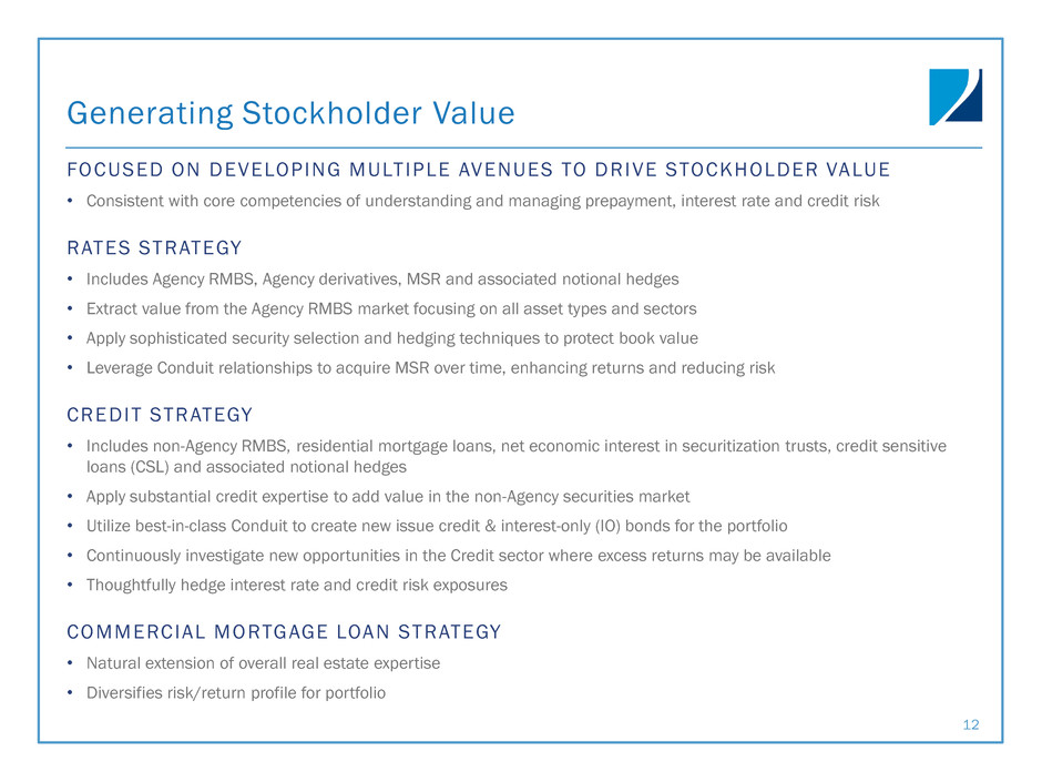 Generating Stockholder Value 12 FOCUSED ON DEVELOPING MULTIPLE AVENUES TO DRIVE STOCKHOLDER VALUE • Consistent with core competencies of understanding and managing prepayment, interest rate and credit risk RATES STRATEGY • Includes Agency RMBS, Agency derivatives, MSR and associated notional hedges • Extract value from the Agency RMBS market focusing on all asset types and sectors • Apply sophisticated security selection and hedging techniques to protect book value • Leverage Conduit relationships to acquire MSR over time, enhancing returns and reducing risk CREDIT STRATEGY • Includes non-Agency RMBS, residential mortgage loans, net economic interest in securitization trusts, credit sensitive loans (CSL) and associated notional hedges • Apply substantial credit expertise to add value in the non-Agency securities market • Utilize best-in-class Conduit to create new issue credit & interest-only (IO) bonds for the portfolio • Continuously investigate new opportunities in the Credit sector where excess returns may be available • Thoughtfully hedge interest rate and credit risk exposures COMMERCIAL MORTGAGE LOAN STRATEGY • Natural extension of overall real estate expertise • Diversifies risk/return profile for portfolio