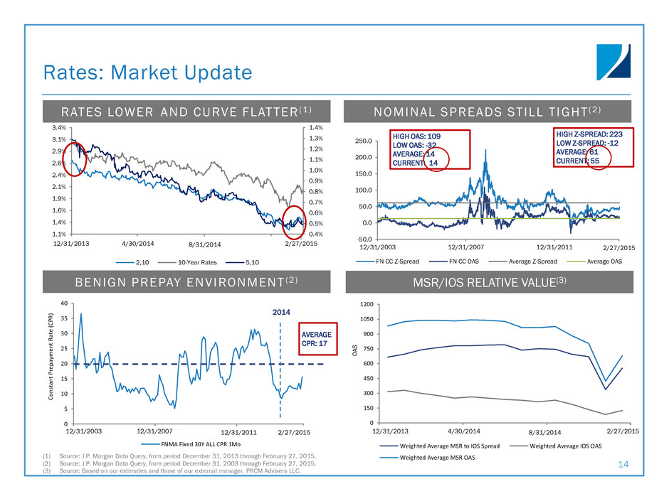 0.4% 0.5% 0.6% 0.7% 0.8% 0.9% 1.0% 1.1% 1.2% 1.3% 1.4% 1.1% 1.4% 1.6% 1.9% 2.1% 2.4% 2.6% 2.9% 3.1% 3.4% 12/31/2013 4/30/2014 8/31/2014 12/31/2014 2,10 10-Year Rates 5,10 0 150 300 450 600 750 900 1050 1200 O A S Weighted Average MSR to IOS Spread Weighted Average IOS OAS Weighted Average MSR OAS 0 5 10 15 20 25 30 35 40 C o n st an t P re p ay m en t R at e (CP R ) FNMA Fixed 30Y ALL CPR 1Mo BENIGN PREPAY ENVIRONMENT (2) Rates: Market Update 14 (1) Source: J.P. Morgan Data Query, from period December 31, 2013 through February 27, 2015. (2) Source: J.P. Morgan Data Query, from period December 31, 2003 through February 27, 2015. (3) Source: Based on our estimates and those of our external manager, PRCM Advisers LLC. RATES LOWER AND CURVE FLATTER (1) 2/27/2015 NOMINAL SPREADS ST ILL T IGHT (2) MSR/IOS RELATIVE VALUE(3) 2/27/2015 HIGH OAS: 109 LOW OAS: -32 AVERAGE: 14 CURRENT: 14 HIGH Z-SPREAD: 223 LOW Z-SPREAD: -12 AVERAGE: 61 CURRENT: 55 2/27/2015 2/27/2015 AVERAGE CPR: 17 2014 -50.0 0.0 50.0 100.0 150.0 200.0 250.0 12/31/2003 12/31/2007 12/31/2011 FN CC Z-Spread FN CC OAS Average Z-Spread Average OAS 12/31/2011 12/31/2003 12/31/2007 8/31/2014 4/30/2014 12/31/2013 8/31/2014 4/30/2014 12/31/2013