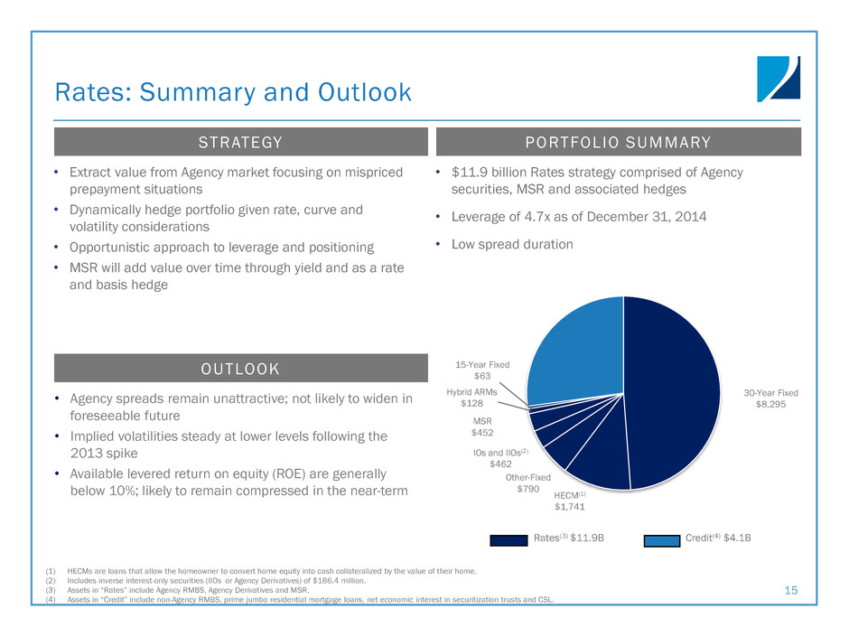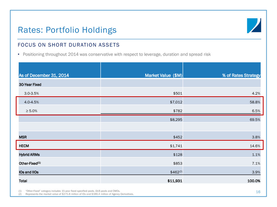 Rates: Summary and Outlook 15 • $11.9 billion Rates strategy comprised of Agency securities, MSR and associated hedges • Leverage of 4.7x as of December 31, 2014 • Low spread duration STRATEGY • Extract value from Agency market focusing on mispriced prepayment situations • Dynamically hedge portfolio given rate, curve and volatility considerations • Opportunistic approach to leverage and positioning • MSR will add value over time through yield and as a rate and basis hedge 30-Year Fixed $8,295 HECM(1) $1,741 Other-Fixed $790 IOs and IIOs(2) $462 Hybrid ARMs $128 PORTFOLIO SUMMARY MSR $452 15-Year Fixed $63 (1) HECMs are loans that allow the homeowner to convert home equity into cash collateralized by the value of their home. (2) Includes inverse interest-only securities (IIOs or Agency Derivatives) of $186.4 million. (3) Assets in “Rates” include Agency RMBS, Agency Derivatives and MSR. (4) Assets in “Credit” include non-Agency RMBS, prime jumbo residential mortgage loans, net economic interest in securitization trusts and CSL. • Agency spreads remain unattractive; not likely to widen in foreseeable future • Implied volatilities steady at lower levels following the 2013 spike • Available levered return on equity (ROE) are generally below 10%; likely to remain compressed in the near-term OUTLOOK Rates(3) $11.9B Credit(4) $4.1B