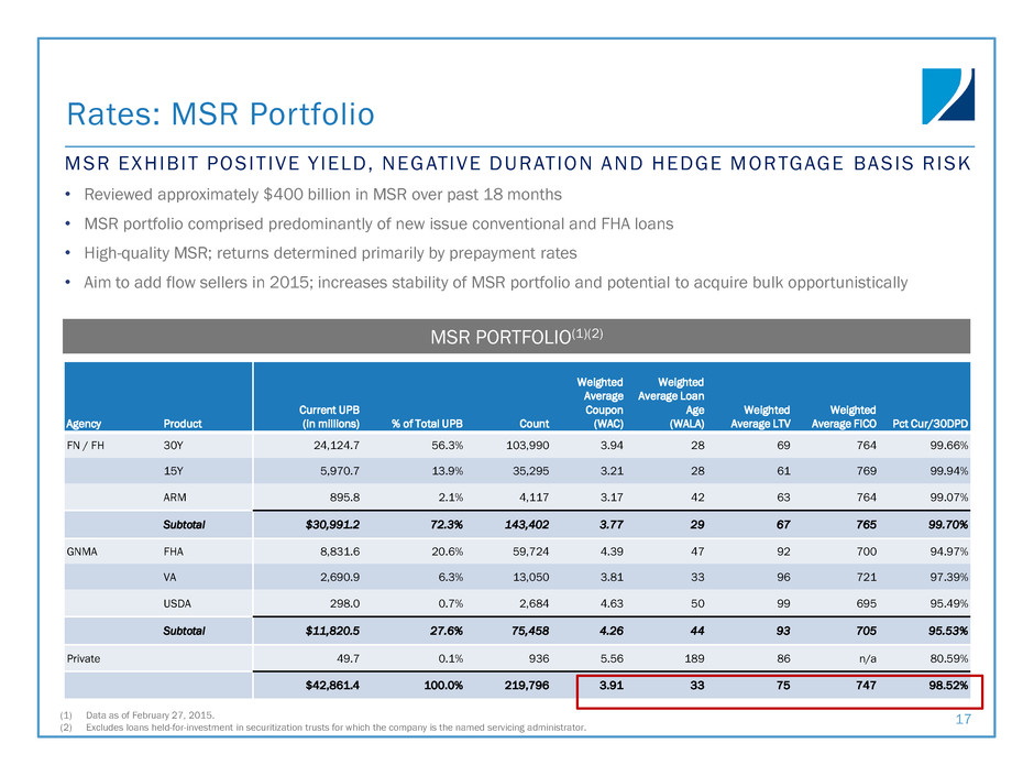 Agency Product Current UPB (in millions) % of Total UPB Count Weighted Average Coupon (WAC) Weighted Average Loan Age (WALA) Weighted Average LTV Weighted Average FICO Pct Cur/30DPD FN / FH 30Y 24,124.7 56.3% 103,990 3.94 28 69 764 99.66% 15Y 5,970.7 13.9% 35,295 3.21 28 61 769 99.94% ARM 895.8 2.1% 4,117 3.17 42 63 764 99.07% Subtotal $30,991.2 72.3% 143,402 3.77 29 67 765 99.70% GNMA FHA 8,831.6 20.6% 59,724 4.39 47 92 700 94.97% VA 2,690.9 6.3% 13,050 3.81 33 96 721 97.39% USDA 298.0 0.7% 2,684 4.63 50 99 695 95.49% Subtotal $11,820.5 27.6% 75,458 4.26 44 93 705 95.53% Private 49.7 0.1% 936 5.56 189 86 n/a 80.59% $42,861.4 100.0% 219,796 3.91 33 75 747 98.52% Rates: MSR Portfolio MSR EXHIBIT POSIT IVE Y IELD, NEGATIVE DURATION AND HEDGE MORTGAGE BASIS R ISK • Reviewed approximately $400 billion in MSR over past 18 months • MSR portfolio comprised predominantly of new issue conventional and FHA loans • High-quality MSR; returns determined primarily by prepayment rates • Aim to add flow sellers in 2015; increases stability of MSR portfolio and potential to acquire bulk opportunistically 17 (1) Data as of February 27, 2015. (2) Excludes loans held-for-investment in securitization trusts for which the company is the named servicing administrator. MSR PORTFOLIO(1)(2)