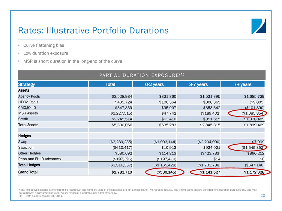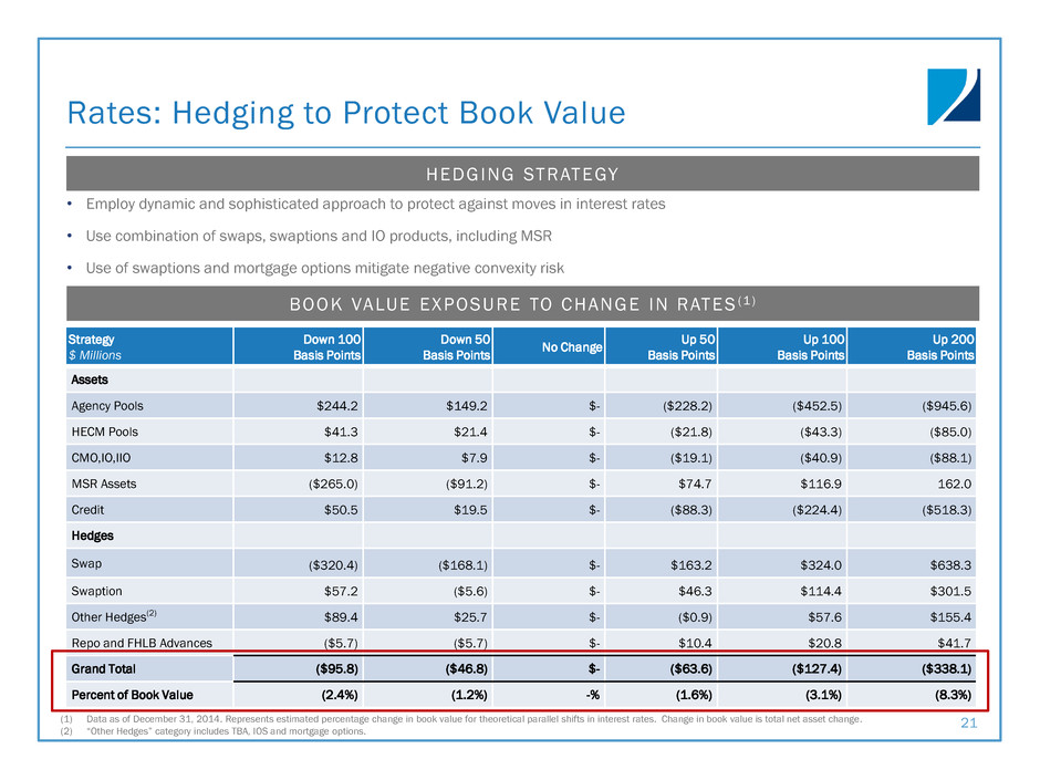 Strategy Total 0-2 years 3-7 years 7+ years Assets Agency Pools $3,528,984 $321,860 $1,521,395 $1,685,729 HECM Pools $405,724 $106,364 $308,365 ($9,005) CMO,IO,IIO $347,359 $95,907 $353,342 ($101,890) MSR Assets ($1,227,515) $47,742 ($189,402) ($1,085,854) Credit $2,245,514 $63,410 $851,615 $1,330,489 Total Assets $5,300,066 $635,283 $2,845,315 $1,819,469 Hedges Swap ($3,289,235) ($1,093,144) ($2,204,090) $7,999 Swaption ($610,417) $10,913 $924,021 ($1,545,352) Other Hedges $580,692 $114,213 ($423,733) $890,212 Repo and FHLB Advances ($197,396) ($197,410) $14 $0 Total Hedges ($3,516,357) ($1,165,428) ($1,703,788) ($647,140) Grand Total $1,783,710 ($530,145) $1,141,527 $1,172,328 Rates: Illustrative Portfolio Durations 20 • Curve flattening bias • Low duration exposure • MSR is short duration in the long-end of the curve Note: The above scenario is intended to be illustrative. The numbers used in the scenarios are not projections of Two Harbors’ results. The above scenarios are provided for illustration purposes only and may not represent all assumptions used. Actual results of a portfolio may differ materially. (1) Data as of December 31, 2014. PARTIAL DURATION EXPOSURE (1 )
