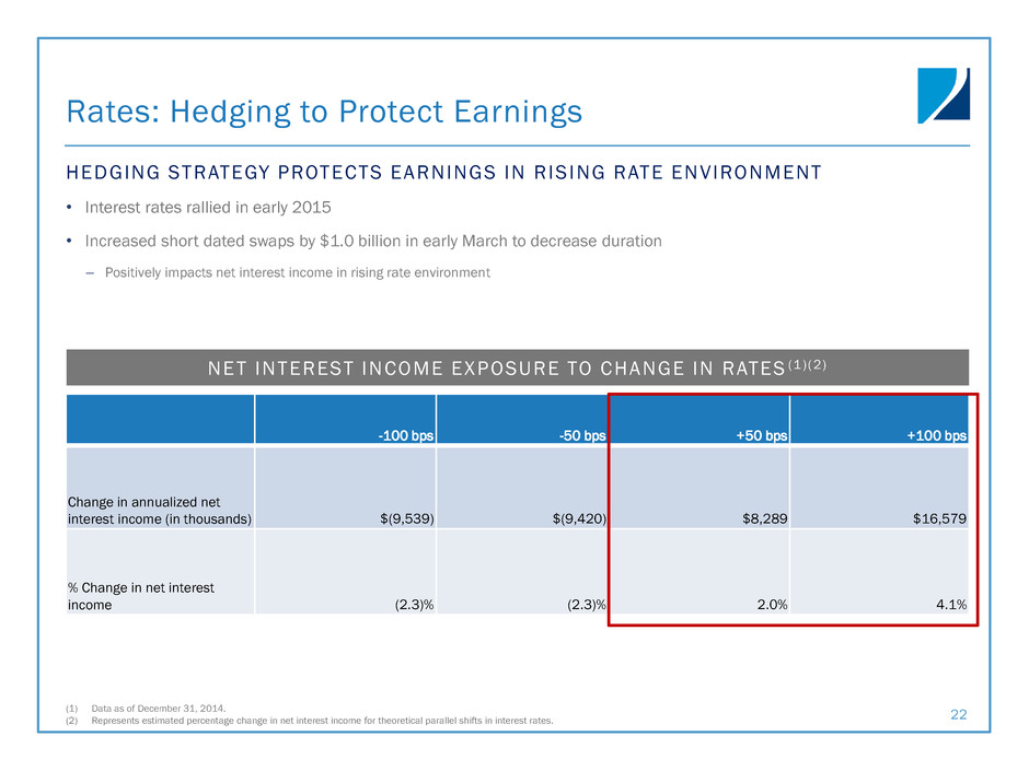 HEDGING STRATEGY Rates: Hedging to Protect Book Value 21 BOOK VALUE EXPOSURE TO CHANGE IN RATES (1 ) • Employ dynamic and sophisticated approach to protect against moves in interest rates • Use combination of swaps, swaptions and IO products, including MSR • Use of swaptions and mortgage options mitigate negative convexity risk Strategy $ Millions Down 100 Basis Points Down 50 Basis Points No Change Up 50 Basis Points Up 100 Basis Points Up 200 Basis Points Assets Agency Pools $244.2 $149.2 $- ($228.2) ($452.5) ($945.6) HECM Pools $41.3 $21.4 $- ($21.8) ($43.3) ($85.0) CMO,IO,IIO $12.8 $7.9 $- ($19.1) ($40.9) ($88.1) MSR Assets ($265.0) ($91.2) $- $74.7 $116.9 162.0 Credit $50.5 $19.5 $- ($88.3) ($224.4) ($518.3) Hedges Swap ($320.4) ($168.1) $- $163.2 $324.0 $638.3 Swaption $57.2 ($5.6) $- $46.3 $114.4 $301.5 Other Hedges(2) $89.4 $25.7 $- ($0.9) $57.6 $155.4 Repo and FHLB Advances ($5.7) ($5.7) $- $10.4 $20.8 $41.7 Grand Total ($95.8) ($46.8) $- ($63.6) ($127.4) ($338.1) Percent of Book Value (2.4%) (1.2%) -% (1.6%) (3.1%) (8.3%) (1) Data as of December 31, 2014. Represents estimated percentage change in book value for theoretical parallel shifts in interest rates. Change in book value is total net asset change. (2) “Other Hedges” category includes TBA, IOS and mortgage options.