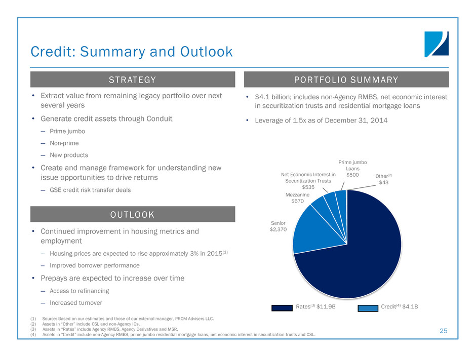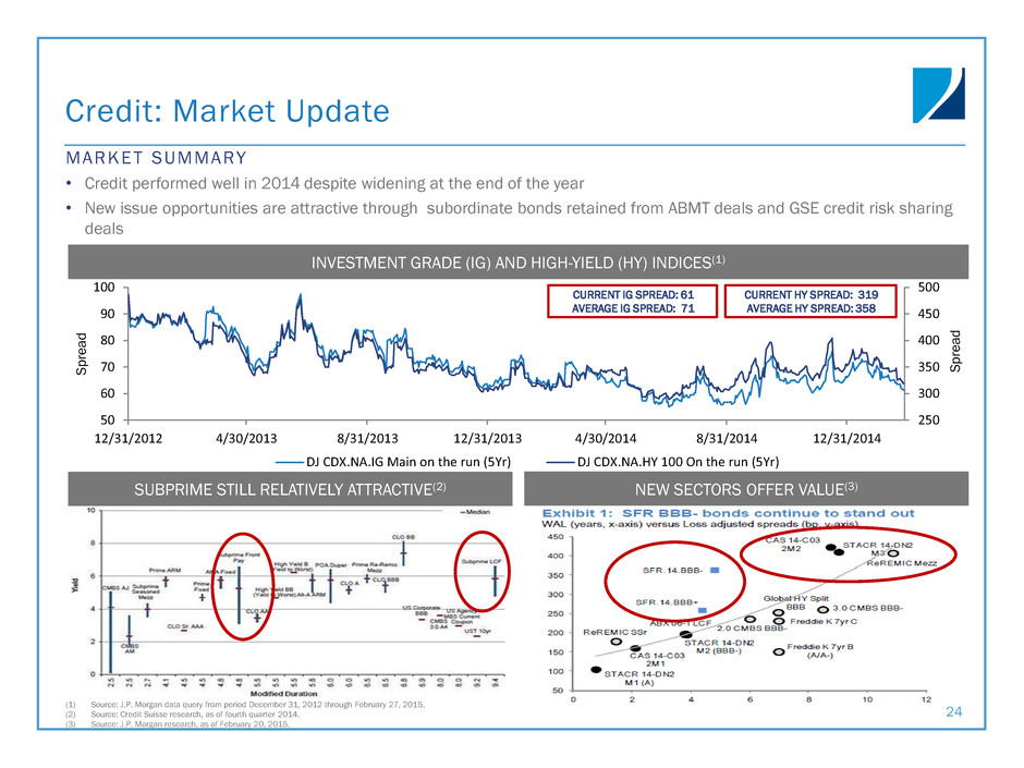 250 300 350 400 450 500 50 60 70 80 90 100 12/31/2012 4/30/2013 8/31/2013 12/31/2013 4/30/2014 8/31/2014 12/31/2014 S p rea d S p rea d DJ CDX.NA.IG Main on the run (5Yr) DJ CDX.NA.HY 100 On the run (5Yr) Credit: Market Update MARKET SUMMARY • Credit performed well in 2014 despite widening at the end of the year • New issue opportunities are attractive through subordinate bonds retained from ABMT deals and GSE credit risk sharing deals 24 INVESTMENT GRADE (IG) AND HIGH-YIELD (HY) INDICES(1) (1) Source: J.P. Morgan data query from period December 31, 2012 through February 27, 2015. (2) Source: Credit Suisse research, as of fourth quarter 2014. (3) Source: J.P. Morgan research, as of February 20, 2015. SUBPRIME STILL RELATIVELY ATTRACTIVE(2) NEW SECTORS OFFER VALUE(3) CURRENT HY SPREAD: 319 AVERAGE HY SPREAD: 358 CURRENT IG SPREAD: 61 AVERAGE IG SPREAD: 71