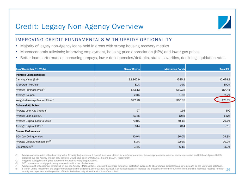 PORTFOLIO SUMMARY OUTLOOK STRATEGY Credit: Summary and Outlook 25 • $4.1 billion; includes non-Agency RMBS, net economic interest in securitization trusts and residential mortgage loans • Leverage of 1.5x as of December 31, 2014 • Continued improvement in housing metrics and employment ‒ Housing prices are expected to rise approximately 3% in 2015(1) ‒ Improved borrower performance • Prepays are expected to increase over time ― Access to refinancing ― Increased turnover • Extract value from remaining legacy portfolio over next several years • Generate credit assets through Conduit ― Prime jumbo ― Non-prime ― New products • Create and manage framework for understanding new issue opportunities to drive returns ― GSE credit risk transfer deals Mezzanine $670 Senior $2,370 Net Economic Interest in Securitization Trusts $535 Prime jumbo Loans $500 Other(2) $43 (1) Source: Based on our estimates and those of our external manager, PRCM Advisers LLC. (2) Assets in “Other” include CSL and non-Agency IOs. (3) Assets in “Rates” include Agency RMBS, Agency Derivatives and MSR. (4) Assets in “Credit” include non-Agency RMBS, prime jumbo residential mortgage loans, net economic interest in securitization trusts and CSL. Rates(3) $11.9B Credit(4) $4.1B