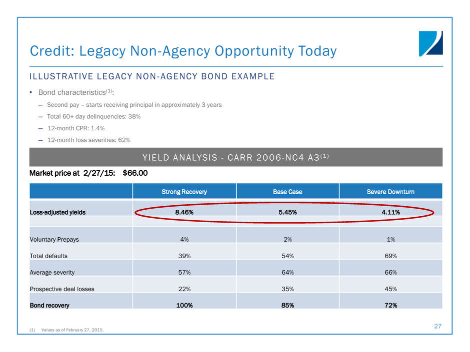 Credit: Legacy Non-Agency Overview IMPROVING CREDIT FUNDAMENTALS WITH UPSIDE OPTIONALIT Y • Majority of legacy non-Agency loans held in areas with strong housing recovery metrics • Macroeconomic tailwinds; improving employment, housing price appreciation (HPA) and lower gas prices • Better loan performance; increasing prepays, lower delinquencies/defaults, stable severities, declining liquidation rates 26 As of December 31, 2014 Senior Bonds Mezzanine Bonds Total P&I Portfolio Characteristics: Carrying Value ($M) $2,162.9 $515.2 $2,678.1 % of Credit Portfolio 81% 19% 100% Average Purchase Price(1) $53.13 $59.78 $54.41 Average Coupon 2.3% 1.6% 2.2% Weighted Average Market Price(2) $72.28 $80.85 $73.79 Collateral Attributes: Average Loan Age (months) 97 116 100 Average Loan Size ($K) $335 $285 $326 Average Original Loan-to-Value 70.8% 70.1% 70.7% Average Original FICO(3) 614 644 619 Current Performance: 60+ Day Delinquencies 30.0% 26.0% 29.3% Average Credit Enhancement(4) 8.3% 22.9% 10.9% 3-Month CPR(5) 3.4% 6.4% 3.9% (1) Average purchase price utilized carrying value for weighting purposes. If current face were utilized for weighting purposes, the average purchase price for senior, mezzanine and total non-Agency RMBS, excluding our non-Agency interest-only portfolio, would have been $49.28, $57.61 and $50.74, respectively. (2) Weighted average market price utilized current face for weighting purposes. (3) FICO represents a mortgage industry accepted credit score of a borrower. (4) Average credit enhancement remaining on our non-Agency RMBS portfolio, which is the average amount of protection available to absorb future credit losses due to defaults on the underlying collateral. (5) 3-Month CPR is reflective of the prepayment speed on the underlying securitization; however, it does not necessarily indicate the proceeds received on our investment tranche. Proceeds received for each security are dependent on the position of the individual security within the structure of each deal.