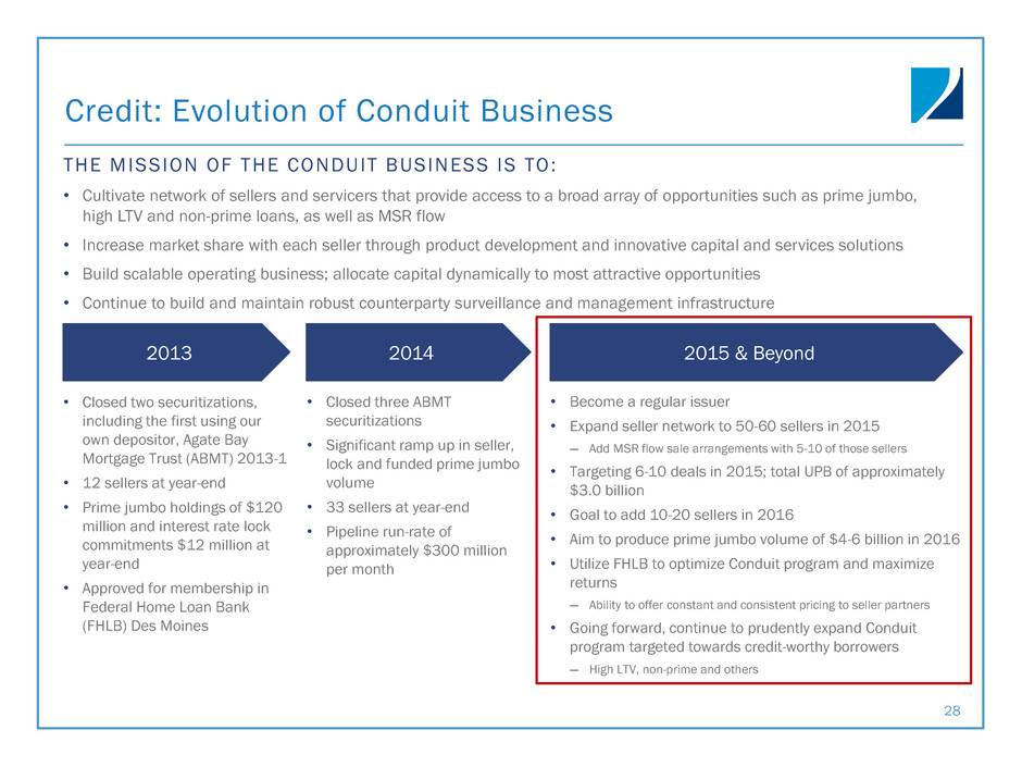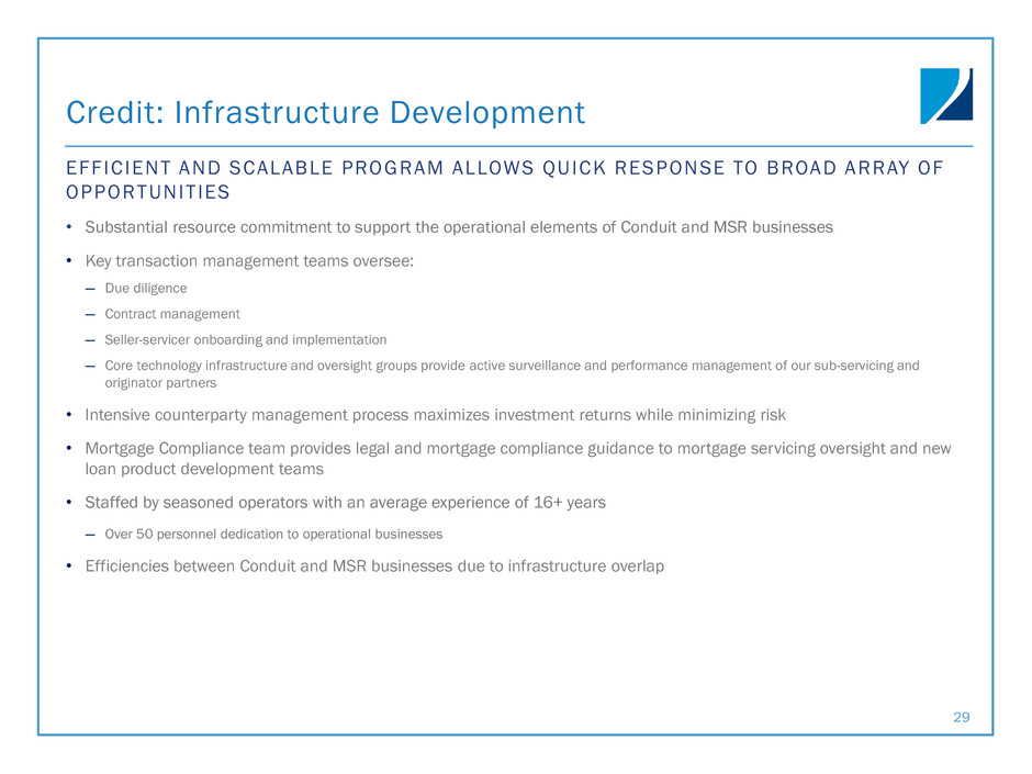 Credit: Evolution of Conduit Business 28 Second Half 2015 THE MISSION OF THE CONDUIT BUSINESS IS TO: • Cultivate network of sellers and servicers that provide access to a broad array of opportunities such as prime jumbo, high LTV and non-prime loans, as well as MSR flow • Increase market share with each seller through product development and innovative capital and services solutions • Build scalable operating business; allocate capital dynamically to most attractive opportunities • Continue to build and maintain robust counterparty surveillance and management infrastructure • Closed two securitizations, including the first using our own depositor, Agate Bay Mortgage Trust (ABMT) 2013-1 • 12 sellers at year-end • Prime jumbo holdings of $120 million and interest rate lock commitments $12 million at year-end • Approved for membership in Federal Home Loan Bank (FHLB) Des Moines 2013 • Closed three ABMT securitizations • Significant ramp up in seller, lock and funded prime jumbo volume • 33 sellers at year-end • Pipeline run-rate of approximately $300 million per month 2015 & Beyond 2014 • Become a regular issuer • Expand seller network to 50-60 sellers in 2015 ― Add MSR flow sale arrangements with 5-10 of those sellers • Targeting 6-10 deals in 2015; total UPB of approximately $3.0 billion • Goal to add 10-20 sellers in 2016 • Aim to produce prime jumbo volume of $4-6 billion in 2016 • Utilize FHLB to optimize Conduit program and maximize returns ― Ability to offer constant and consistent pricing to seller partners • Going forward, continue to prudently expand Conduit program targeted towards credit-worthy borrowers ― High LTV, non-prime and others