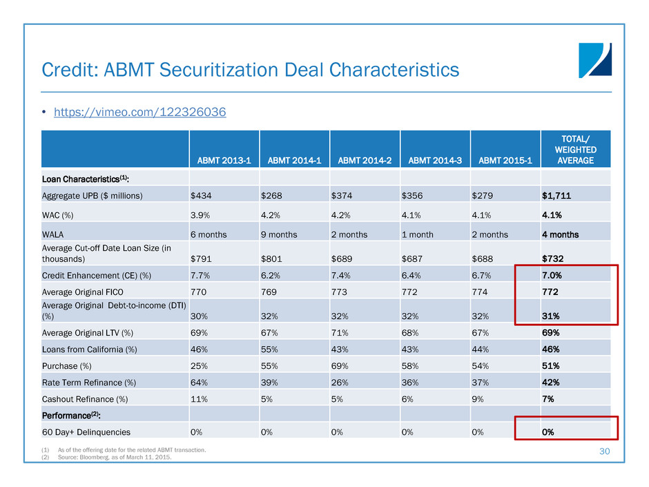 Credit: ABMT Securitization Deal Characteristics ABMT 2013-1 ABMT 2014-1 ABMT 2014-2 ABMT 2014-3 ABMT 2015-1 TOTAL/ WEIGHTED AVERAGE Loan Characteristics(1): Aggregate UPB ($ millions) $434 $268 $374 $356 $279 $1,711 WAC (%) 3.9% 4.2% 4.2% 4.1% 4.1% 4.1% WALA 6 months 9 months 2 months 1 month 2 months 4 months Average Cut-off Date Loan Size (in thousands) $791 $801 $689 $687 $688 $732 Credit Enhancement (CE) (%) 7.7% 6.2% 7.4% 6.4% 6.7% 7.0% Average Original FICO 770 769 773 772 774 772 Average Original Debt-to-income (DTI) (%) 30% 32% 32% 32% 32% 31% Average Original LTV (%) 69% 67% 71% 68% 67% 69% Loans from California (%) 46% 55% 43% 43% 44% 46% Purchase (%) 25% 55% 69% 58% 54% 51% Rate Term Refinance (%) 64% 39% 26% 36% 37% 42% Cashout Refinance (%) 11% 5% 5% 6% 9% 7% Performance(2): 60 Day+ Delinquencies 0% 0% 0% 0% 0% 0% 30 (1) As of the offering date for the related ABMT transaction. (2) Source: Bloomberg, as of March 11, 2015. • https://vimeo.com/122326036