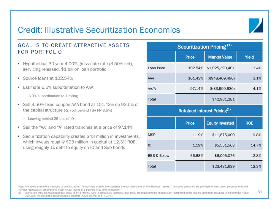 Credit: Illustrative Securitization Economics 31 GOAL IS TO CREATE ATTRACTIVE ASSETS FOR PORTFOLIO • Hypothetical 30-year 4.00% gross note rate (3.50% net), servicing released, $1 billion loan portfolio • Source loans at 102.54% • Estimate 6.5% subordination to AAA; – 3.0% subordination to A-rating • Sell 3.50% fixed coupon AAA bond at 101.43% on 93.5% of the capital structure (-2.75% behind TBA FN 3.5%) – Leaving behind 25 bps of IO • Sell the “AA” and “A” rated tranches at a price of 97.14% • Securitization capability creates $43 million in investments, which invests roughly $23 million in capital at 12.3% ROE, using roughly 1x debt-to-equity on IO and Sub bonds Note: The above scenario is intended to be illustrative. The numbers used in the scenarios are not projections of Two Harbors’ results. The above scenarios are provided for illustration purposes only and may not represent all assumptions used. Actual results of a portfolio may differ materially. (1) Illustration excludes estimated deal costs of $4.4 million. Due to accounting elections, deal costs are required to be immediately recognized in the income statement resulting in incremental ROE of 0.2% over the life of the securities (i.e. economic ROE is estimated at 12.1%). Securitization Pricing (1) Price Market Value Yield Loan Price 102.54% $1,025,390,401 3.4% AAA 101.43% $(948,409,490) 3.1% AA/A 97.14% $(33,999,630) 4.1% Total $42,981,281 Retained Interest Pricing(1) Price Equity Invested ROE MSR 1.19% $11,875,000 9.8% IO 1.19% $5,551,563 14.7% BBB & Below 66.68% $6,005,076 12.8% Total $23,431,639 12.3%