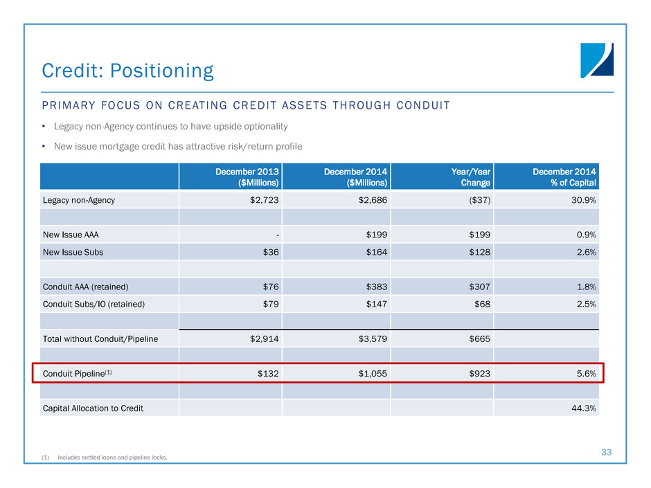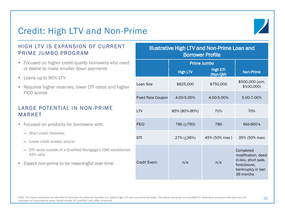 Credit: High LTV and Non-Prime 32 HIGH LT V IS EXPANSION OF CURRENT PRIME JUMBO PROGRAM • Focused on higher credit-quality borrowers who need or desire to make smaller down payments • Loans up to 90% LTV • Requires higher reserves, lower DTI ratios and higher FICO scores LARGE POTENTIAL IN NON -PRIME MARKET • Focused on products for borrowers with: ― Short credit histories; ― Lower credit scores; and/or ― DTI ratios outside of a Qualified Mortgage’s (QM) established 43% ratio • Expect non-prime to be meaningful over time Note: The above scenarios are intended to illustrate the potential benefits to a typical high LTV and non-prime borrower. The above scenarios are provided for illustration purposes only and may not represent all assumptions used. Actual results of a portfolio may differ materially. Illustrative High LTV and Non-Prime Loan and Borrower Profile Prime Jumbo High LTV High DTI (Non-QM) Non-Prime Loan Size $825,000 $750,000 $500,000 (min. $100,000) Fixed Rate Coupon 4.00-5.00% 4.00-5.00% 5.00-7.00% LTV 85% (80%-90%) 70% 70% FICO 780 (>760) 780 Mid-600’s DTI 27% (<36%) 45% (50% max.) 35% (50% max) Credit Event: n/a n/a Completed modification, deed- in-lieu, short sale, foreclosure, bankruptcy in last 36 months