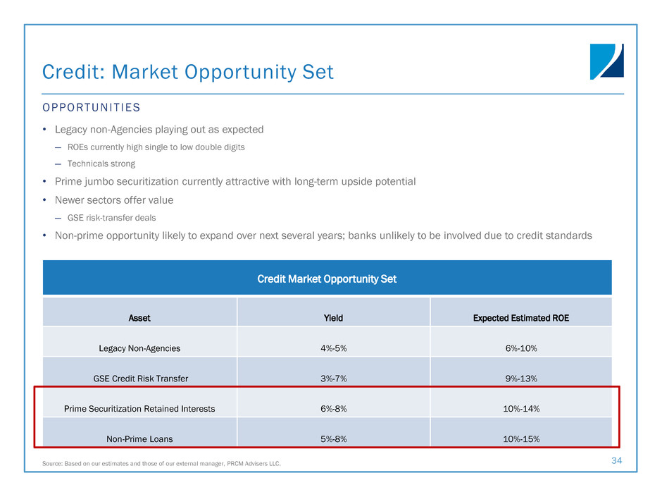 Credit: Market Opportunity Set 34 Credit Market Opportunity Set Asset Yield Expected Estimated ROE Legacy Non-Agencies 4%-5% 6%-10% GSE Credit Risk Transfer 3%-7% 9%-13% Prime Securitization Retained Interests 6%-8% 10%-14% Non-Prime Loans 5%-8% 10%-15% OPPORTUNIT IES • Legacy non-Agencies playing out as expected ― ROEs currently high single to low double digits ― Technicals strong • Prime jumbo securitization currently attractive with long-term upside potential • Newer sectors offer value ― GSE risk-transfer deals • Non-prime opportunity likely to expand over next several years; banks unlikely to be involved due to credit standards Source: Based on our estimates and those of our external manager, PRCM Advisers LLC.