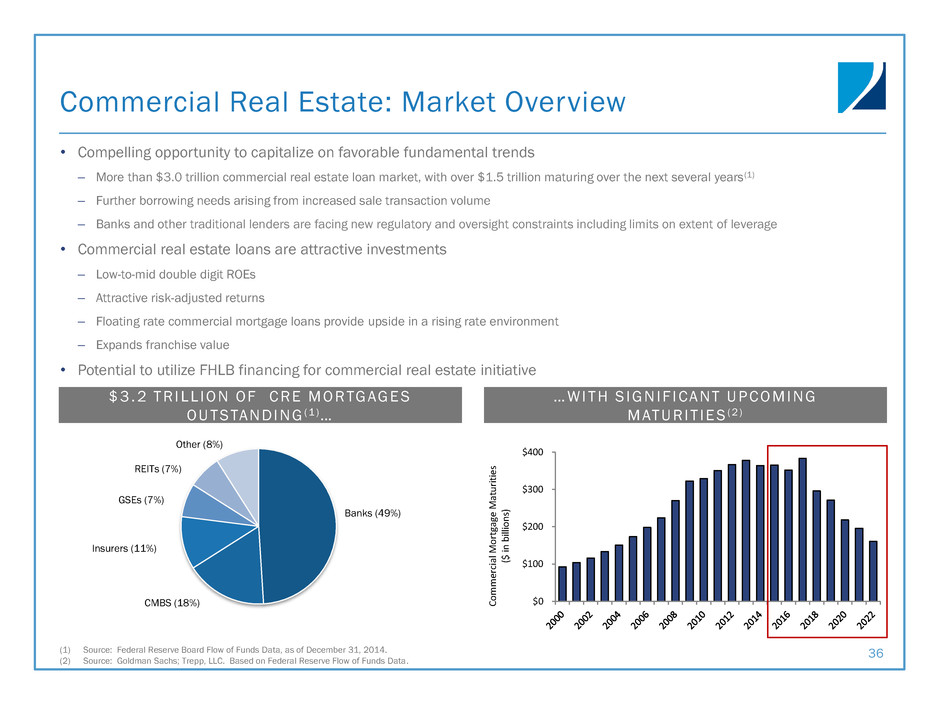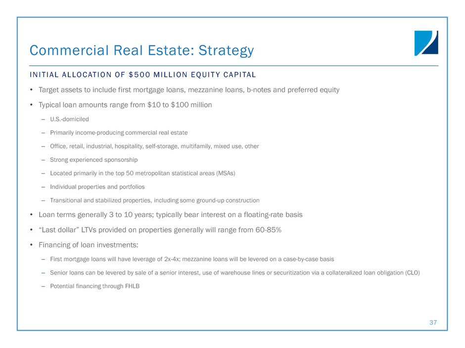 (1) Source: Federal Reserve Board Flow of Funds Data, as of December 31, 2014. (2) Source: Goldman Sachs; Trepp, LLC. Based on Federal Reserve Flow of Funds Data. Commercial Real Estate: Market Overview • Compelling opportunity to capitalize on favorable fundamental trends – More than $3.0 trillion commercial real estate loan market, with over $1.5 trillion maturing over the next several years(1) – Further borrowing needs arising from increased sale transaction volume – Banks and other traditional lenders are facing new regulatory and oversight constraints including limits on extent of leverage • Commercial real estate loans are attractive investments – Low-to-mid double digit ROEs – Attractive risk-adjusted returns – Floating rate commercial mortgage loans provide upside in a rising rate environment – Expands franchise value • Potential to utilize FHLB financing for commercial real estate initiative …WITH S IGN IF ICANT UPCOMING M AT U R IT IE S (2 ) $ 3 . 2 T R I L L I O N O F C R E M O RTG AG E S O U T STANDI NG (1 )… Banks (49%) Other (8%) REITs (7%) GSEs (7%) Insurers (11%) CMBS (18%) $0 $100 $200 $300 $400 C o m m er ci al M o rt ga ge M at u ri ti es ($ in b ill io n s) 36