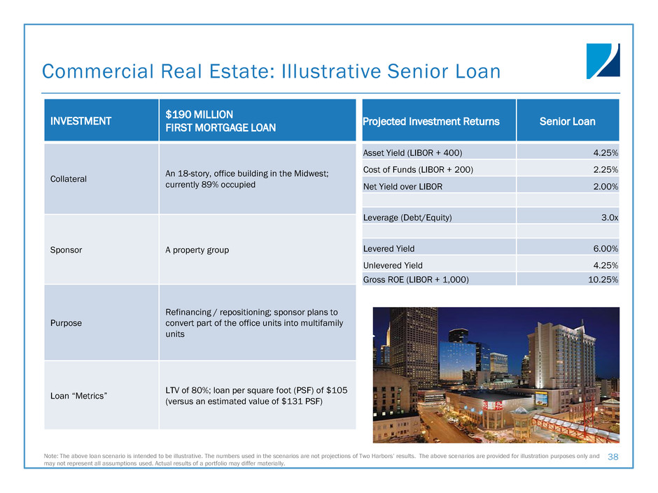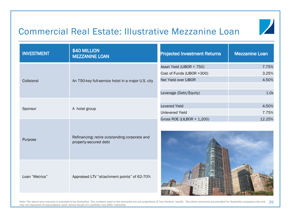Commercial Real Estate: Illustrative Senior Loan 38 INVESTMENT $190 MILLION FIRST MORTGAGE LOAN Collateral An 18-story, office building in the Midwest; currently 89% occupied Sponsor A property group Purpose Refinancing / repositioning; sponsor plans to convert part of the office units into multifamily units Loan “Metrics” LTV of 80%; loan per square foot (PSF) of $105 (versus an estimated value of $131 PSF) Note: The above loan scenario is intended to be illustrative. The numbers used in the scenarios are not projections of Two Harbors’ results. The above scenarios are provided for illustration purposes only and may not represent all assumptions used. Actual results of a portfolio may differ materially. Projected Investment Returns Senior Loan Asset Yield (LIBOR + 400) 4.25% Cost of Funds (LIBOR + 200) 2.25% Net Yield over LIBOR 2.00% Leverage (Debt/Equity) 3.0x Levered Yield 6.00% Unlevered Yield 4.25% Gross ROE (LIBOR + 1,000) 10.25%