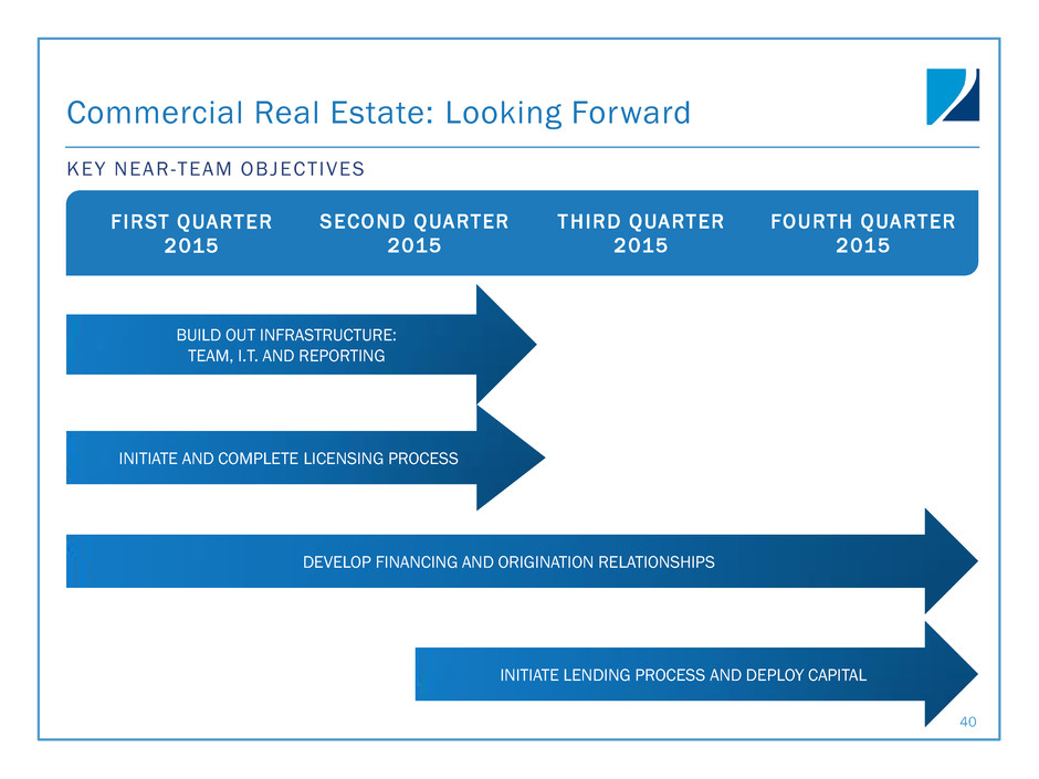F IRST QUARTER 2015 SECOND QUARTER 2015 THIRD QUARTER 2015 FOURTH QUARTER 2015 BUILD OUT INFRASTRUCTURE: TEAM, I.T. AND REPORTING Commercial Real Estate: Looking Forward 40 KEY NEAR-TEAM OBJECTIVES INITIATE LENDING PROCESS AND DEPLOY CAPITAL DEVELOP FINANCING AND ORIGINATION RELATIONSHIPS INITIATE AND COMPLETE LICENSING PROCESS