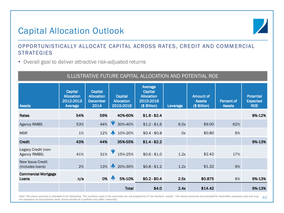 Assets Capital Allocation 2012-2013 Average Capital Allocation December 2014 Capital Allocation 2015-2016 Average Capital Allocation 2015-2016 ($ Billion) Leverage Amount of Assets ($ Billion) Percent of Assets Potential Expected ROE Rates 54% 56% 40%-60% $1.6 - $2.4 8%-12% Agency RMBS 53% 44% 30%-40% $1.2 - $1.6 6.5x $9.00 62% MSR 1% 12% 10%-20% $0.4 - $0.8 0x $0.80 6% Credit 43% 44% 35%-55% $1.4 - $2.2 9%-13% Legacy Credit (non- Agency RMBS) 41% 31% 15%-25% $0.6 - $1.0 1.2x $2.42 17% New Issue Credit (includes loans) 2% 13% 20%-30% $0.8 - $1.2 1.2x $1.32 9% Commercial Mortgage Loans n/a 0% 5%-10% $0.2 - $0.4 2.5x $0.875 6% 9%-13% Total $4.0 2.4x $14.42 9%-13% Capital Allocation Outlook OPPORTUNISTICALLY ALLOCATE CAPITAL ACROSS RATES, CREDIT AND COMM ERCIAL STRATEGIES • Overall goal to deliver attractive risk-adjusted returns 42 ILLUSTRATIVE FUTURE CAPITAL ALLOCATION AND POTENTIAL ROE Note: The above scenario is intended to be illustrative. The numbers used in the scenarios are not projections of Two Harbors’ results. The above scenarios are provided for illustration purposes only and may not represent all assumptions used. Actual results of a portfolio may differ materially.