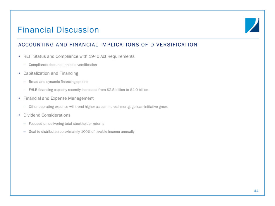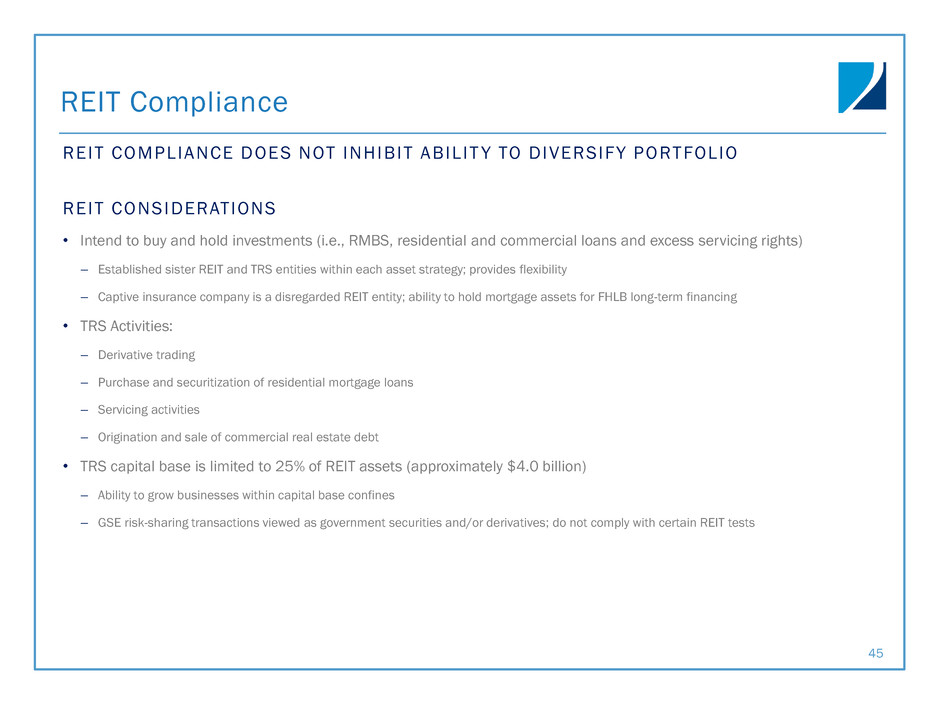 Financial Discussion ACCOUNTING AND FINANCIAL IMPLICATIONS OF DIVERSIFICATION • REIT Status and Compliance with 1940 Act Requirements – Compliance does not inhibit diversification • Capitalization and Financing – Broad and dynamic financing options – FHLB financing capacity recently increased from $2.5 billion to $4.0 billion • Financial and Expense Management – Other operating expense will trend higher as commercial mortgage loan initiative grows • Dividend Considerations – Focused on delivering total stockholder returns – Goal to distribute approximately 100% of taxable income annually 44