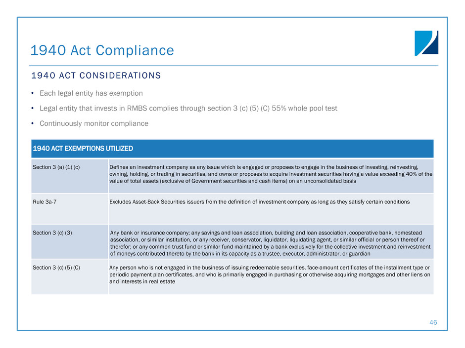REIT Compliance REIT COMPLIANCE DOES NOT INHIBIT ABIL IT Y TO DIVERSIFY PORTFOLIO REIT CONSIDERATIONS • Intend to buy and hold investments (i.e., RMBS, residential and commercial loans and excess servicing rights) – Established sister REIT and TRS entities within each asset strategy; provides flexibility – Captive insurance company is a disregarded REIT entity; ability to hold mortgage assets for FHLB long-term financing • TRS Activities: – Derivative trading – Purchase and securitization of residential mortgage loans – Servicing activities – Origination and sale of commercial real estate debt • TRS capital base is limited to 25% of REIT assets (approximately $4.0 billion) – Ability to grow businesses within capital base confines – GSE risk-sharing transactions viewed as government securities and/or derivatives; do not comply with certain REIT tests 45