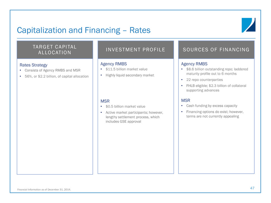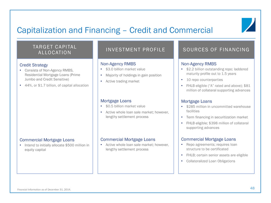 Capitalization and Financing – Rates Rates Strategy • Consists of Agency RMBS and MSR • 56%, or $2.2 billion, of capital allocation TARGET CAPITAL ALLOCATION Agency RMBS • $11.5 billion market value • Highly liquid secondary market MSR • $0.5 billion market value • Active market participants; however, lengthy settlement process, which includes GSE approval INVESTMENT PROFILE Agency RMBS • $8.6 billion outstanding repo; laddered maturity profile out to 6 months • 22 repo counterparties • FHLB eligible; $2.3 billion of collateral supporting advances MSR • Cash funding by excess capacity • Financing options do exist; however, terms are not currently appealing SOURCES OF F INANCING 47 47 Financial Information as of December 31, 2014.