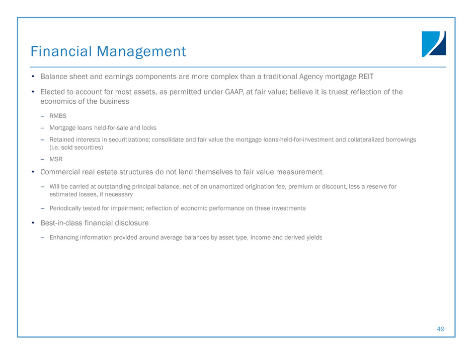 • Balance sheet and earnings components are more complex than a traditional Agency mortgage REIT • Elected to account for most assets, as permitted under GAAP, at fair value; believe it is truest reflection of the economics of the business – RMBS – Mortgage loans held-for-sale and locks – Retained interests in securitizations; consolidate and fair value the mortgage loans-held-for-investment and collateralized borrowings (i.e. sold securities) – MSR • Commercial real estate structures do not lend themselves to fair value measurement – Will be carried at outstanding principal balance, net of an unamortized origination fee, premium or discount, less a reserve for estimated losses, if necessary – Periodically tested for impairment; reflection of economic performance on these investments • Best-in-class financial disclosure – Enhancing information provided around average balances by asset type, income and derived yields Financial Management 49