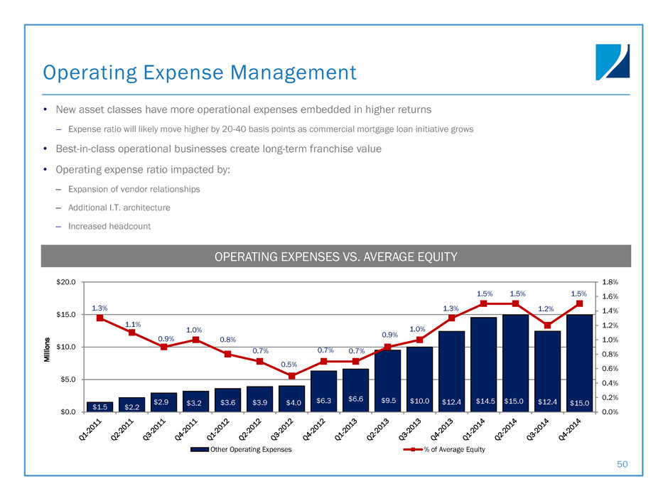 Operating Expense Management 50 • New asset classes have more operational expenses embedded in higher returns – Expense ratio will likely move higher by 20-40 basis points as commercial mortgage loan initiative grows • Best-in-class operational businesses create long-term franchise value • Operating expense ratio impacted by: – Expansion of vendor relationships – Additional I.T. architecture – Increased headcount OPERATING EXPENSES VS. AVERAGE EQUITY $1.5 $2.2 $2.9 $3.2 $3.6 $3.9 $4.0 $6.3 $6.6 $9.5 $10.0 $12.4 $14.5 $15.0 $12.4 $15.0 1.3% 1.1% 0.9% 1.0% 0.8% 0.7% 0.5% 0.7% 0.7% 0.9% 1.0% 1.3% 1.5% 1.5% 1.2% 1.5% 0.0% 0.2% 0.4% 0.6% 0.8% 1.0% 1.2% 1.4% 1.6% 1.8% $0.0 $5.0 $10.0 $15.0 $20.0 M il lion s Other Operating Expenses % of Average Equity