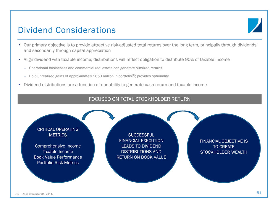 Dividend Considerations 51 FINANCIAL OBJECTIVE IS TO CREATE STOCKHOLDER WEALTH SUCCESSFUL FINANCIAL EXECUTION LEADS TO DIVIDEND DISTRIBUTIONS AND RETURN ON BOOK VALUE CRITICAL OPERATING METRICS Comprehensive Income Taxable Income Book Value Performance Portfolio Risk Metrics • Our primary objective is to provide attractive risk-adjusted total returns over the long term, principally through dividends and secondarily through capital appreciation • Align dividend with taxable income; distributions will reflect obligation to distribute 90% of taxable income – Operational businesses and commercial real estate can generate outsized returns – Hold unrealized gains of approximately $850 million in portfolio(1); provides optionality • Dividend distributions are a function of our ability to generate cash return and taxable income FOCUSED ON TOTAL STOCKHOLDER RETURN (1) As of December 31, 2014.