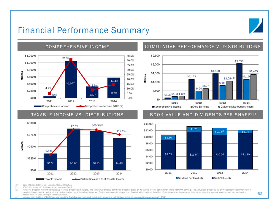 TA X ABL E I N C O M E V S . D I ST R I BUT IO N S Financial Performance Summary 52 C O M P R E H E N S I V E I N C O M E C U M U L AT I VE P E R FO R M AN CE V. D I ST R I BUT I O NS BO O K VA LU E A N D D I V I DE NDS P E R S H A R E (3 ) (1) Does not include Silver Bay common stock distribution. (2) 100.3% includes $10.7 million carried over from 2012. (3) Historical dividends may not be indicative of future dividend distributions. The company ultimately distributes dividends based on its taxable income per common share, not GAAP earnings. The annualized dividend yield on the company’s common stock is calculated based on the closing price of the last trading day of the relevant quarter. Diluted shares outstanding at end of period, which includes the effect of dilutive outstanding warrants determined using the treasury stock method, are used as the denominator for book value per share calculation. (4) Includes cash dividend of $0.32 per share and the Silver Bay common stock distribution amounting to $1.01 per share, as measured in accordance with GAAP. $46 $1,047 $327 $578 4.9% 40.7% 8.5% 14.4% 0.0% 5.0% 10.0% 15.0% 20.0% 25.0% 30.0% 35.0% 40.0% 45.0% $0.0 $200.0 $400.0 $600.0 $800.0 $1,000.0 $1,200.0 2011 2012 2013 2014 M il li o n s Comprehensive Income Comprehensive Income ROAE (%) $9.03 $11.54 $10.56 $11.10 $1.60 $1.71 $2.18(4) $1.04 $0.00 $2.00 $4.00 $6.00 $8.00 $10.00 $12.00 $14.00 2011 2012 2013 2014 Dividend Declared ($) Book Value ($) $177 $440 $415 $338 92.3% 97.6% 100.3% (2) 112.1% $0.0 $125.0 $250.0 $375.0 $500.0 2011 2012 2013 2014 M il li o n s Taxable Income Distributions as a % of Taxable Income $105 $1,153 $1,480 $2,058 $183 $494 $806 $1,150 $197 $627 $1,054(1) $1,435 $0 $500 $1,000 $1,500 $2,000 $2,500 2011 2012 2013 2014 M il li o n s Comprehensive Income Core Earnings Dividend Distributions (cash)