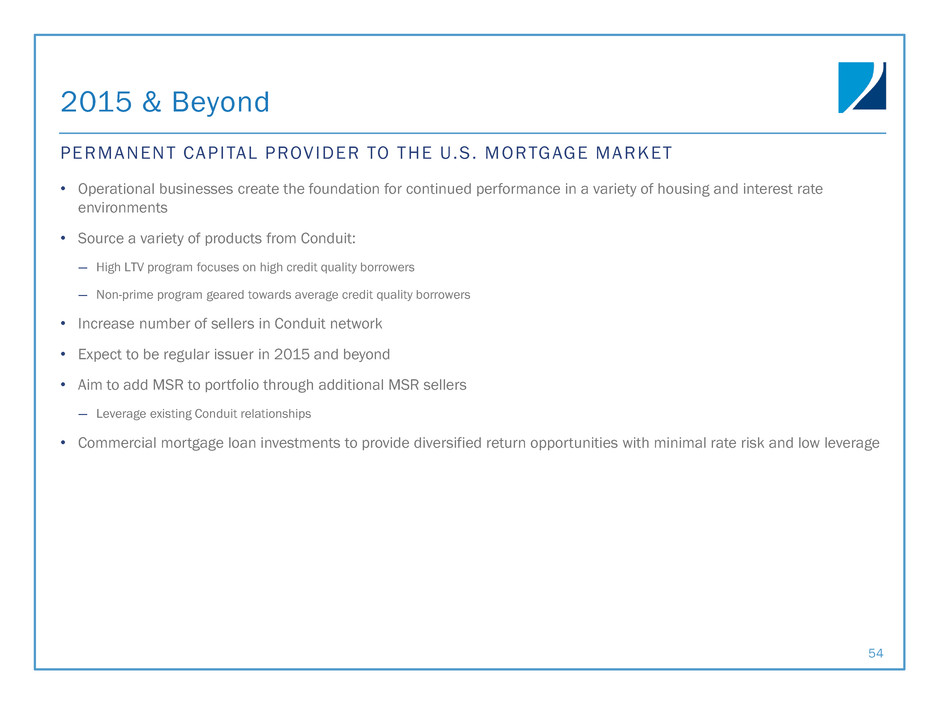 2015 & Beyond 54 PERMANENT CAPITAL PROVIDER TO THE U.S . MORTGAGE MARKET • Operational businesses create the foundation for continued performance in a variety of housing and interest rate environments • Source a variety of products from Conduit: ― High LTV program focuses on high credit quality borrowers ― Non-prime program geared towards average credit quality borrowers • Increase number of sellers in Conduit network • Expect to be regular issuer in 2015 and beyond • Aim to add MSR to portfolio through additional MSR sellers ― Leverage existing Conduit relationships • Commercial mortgage loan investments to provide diversified return opportunities with minimal rate risk and low leverage