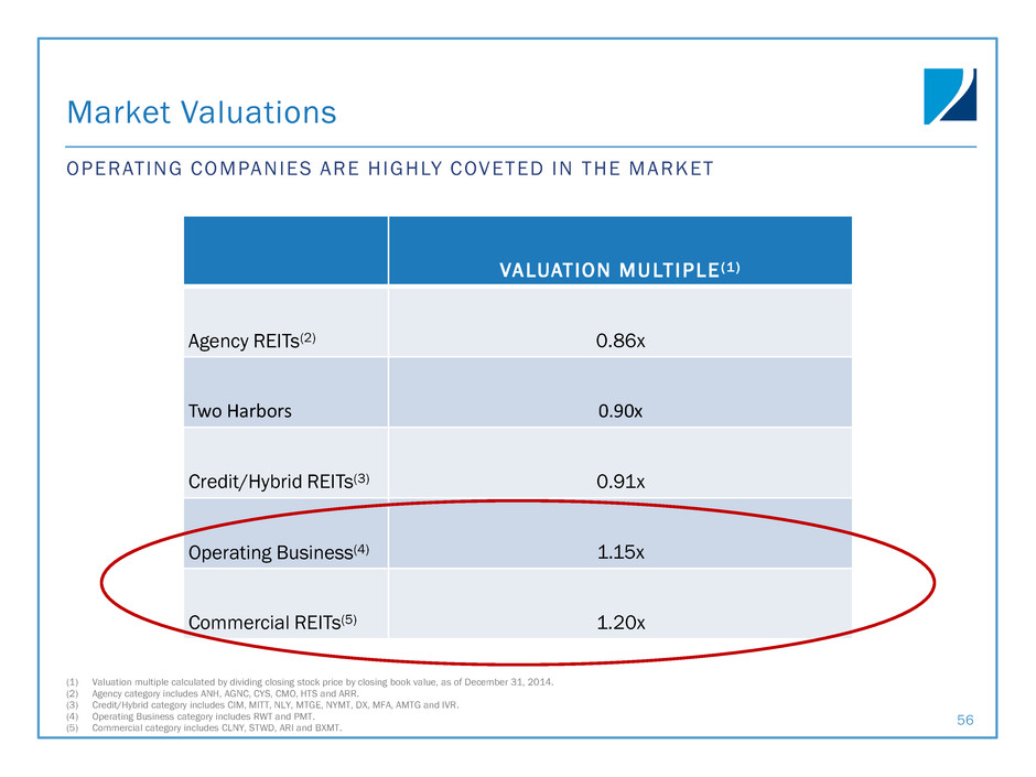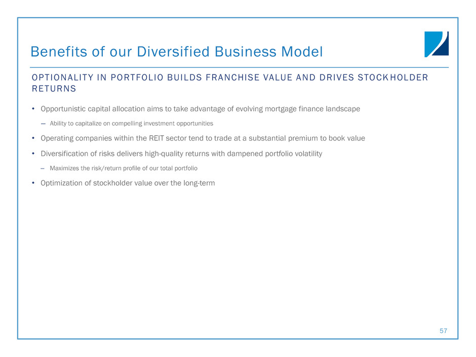 Market Valuations 56 OPERATING COMPANIES ARE HIGHLY COVETED IN THE MARKET (1) Valuation multiple calculated by dividing closing stock price by closing book value, as of December 31, 2014. (2) Agency category includes ANH, AGNC, CYS, CMO, HTS and ARR. (3) Credit/Hybrid category includes CIM, MITT, NLY, MTGE, NYMT, DX, MFA, AMTG and IVR. (4) Operating Business category includes RWT and PMT. (5) Commercial category includes CLNY, STWD, ARI and BXMT. VALUATION MULTIPLE (1) Agency REITs(2) 0.86x Two Harbors 0.90x Credit/Hybrid REITs(3) 0.91x Operating Business(4) 1.15x Commercial REITs(5) 1.20x