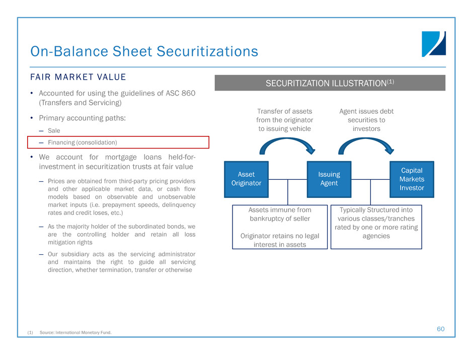 On-Balance Sheet Securitizations 60 FAIR MARKET VALUE • Accounted for using the guidelines of ASC 860 (Transfers and Servicing) • Primary accounting paths: ― Sale ― Financing (consolidation) • We account for mortgage loans held-for- investment in securitization trusts at fair value ― Prices are obtained from third-party pricing providers and other applicable market data, or cash flow models based on observable and unobservable market inputs (i.e. prepayment speeds, delinquency rates and credit loses, etc.) ― As the majority holder of the subordinated bonds, we are the controlling holder and retain all loss mitigation rights ― Our subsidiary acts as the servicing administrator and maintains the right to guide all servicing direction, whether termination, transfer or otherwise (1) Source: International Monetary Fund. Asset Originator Issuing Agent Capital Markets Investor Transfer of assets from the originator to issuing vehicle Agent issues debt securities to investors Assets immune from bankruptcy of seller Originator retains no legal interest in assets Typically Structured into various classes/tranches rated by one or more rating agencies SECURITIZATION ILLUSTRATION(1)