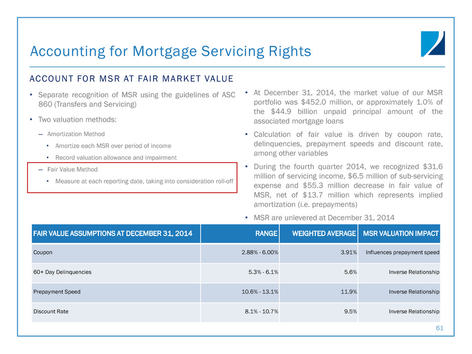 Accounting for Mortgage Servicing Rights 61 ACCOUNT FOR MSR AT FA IR MARKET VALUE • Separate recognition of MSR using the guidelines of ASC 860 (Transfers and Servicing) • Two valuation methods: ― Amortization Method • Amortize each MSR over period of income • Record valuation allowance and impairment ― Fair Value Method • Measure at each reporting date, taking into consideration roll-off FAIR VALUE ASSUMPTIONS AT DECEMBER 31, 2014 RANGE WEIGHTED AVERAGE MSR VALUATION IMPACT Coupon 2.88% - 6.00% 3.91% Influences prepayment speed 60+ Day Delinquencies 5.3% - 6.1% 5.6% Inverse Relationship Prepayment Speed 10.6% - 13.1% 11.9% Inverse Relationship Discount Rate 8.1% - 10.7% 9.5% Inverse Relationship • At December 31, 2014, the market value of our MSR portfolio was $452.0 million, or approximately 1.0% of the $44.9 billion unpaid principal amount of the associated mortgage loans • Calculation of fair value is driven by coupon rate, delinquencies, prepayment speeds and discount rate, among other variables • During the fourth quarter 2014, we recognized $31.6 million of servicing income, $6.5 million of sub-servicing expense and $55.3 million decrease in fair value of MSR, net of $13.7 million which represents implied amortization (i.e. prepayments) • MSR are unlevered at December 31, 2014