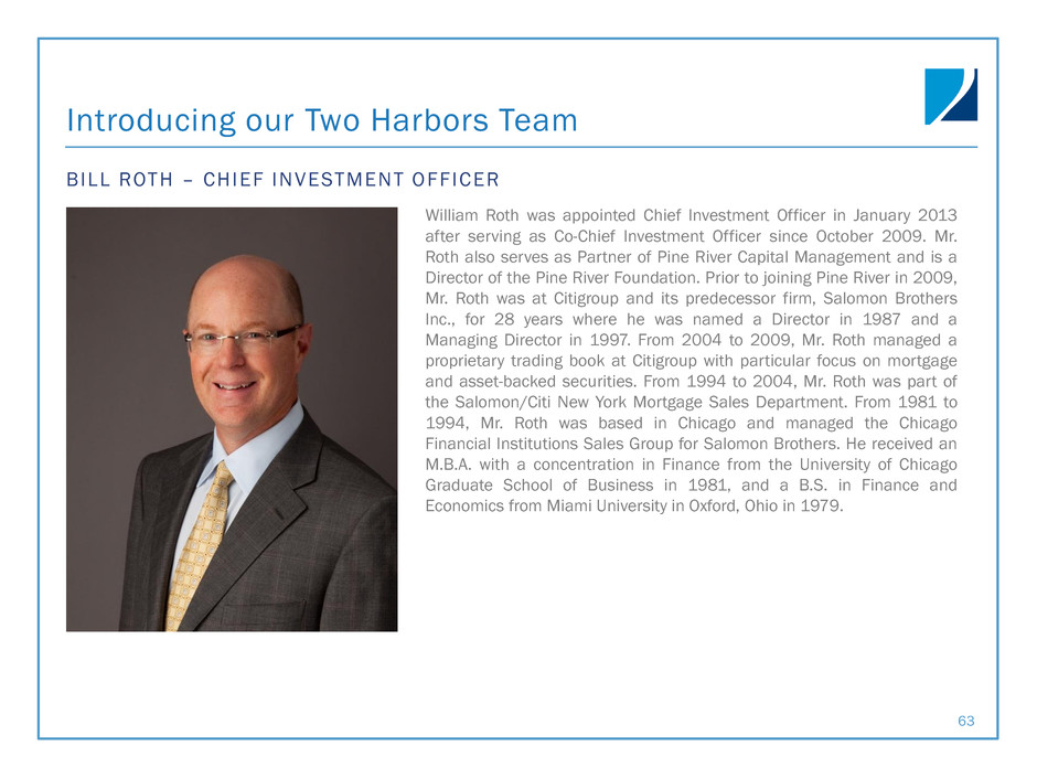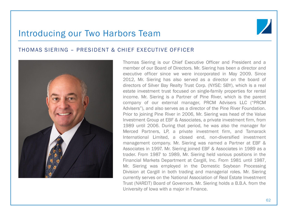 Introducing our Two Harbors Team 62 THOMAS S IERING – PRESIDENT & CHIEF EXECUTIVE OFFICER Thomas Siering is our Chief Executive Officer and President and a member of our Board of Directors. Mr. Siering has been a director and executive officer since we were incorporated in May 2009. Since 2012, Mr. Siering has also served as a director on the board of directors of Silver Bay Realty Trust Corp. (NYSE: SBY), which is a real estate investment trust focused on single-family properties for rental income. Mr. Siering is a Partner of Pine River, which is the parent company of our external manager, PRCM Advisers LLC (“PRCM Advisers”), and also serves as a director of the Pine River Foundation. Prior to joining Pine River in 2006, Mr. Siering was head of the Value Investment Group at EBF & Associates, a private investment firm, from 1989 until 2006. During that period, he was also the manager for Merced Partners, LP, a private investment firm, and Tamarack International Limited, a closed end, non-diversified investment management company. Mr. Siering was named a Partner at EBF & Associates in 1997. Mr. Siering joined EBF & Associates in 1989 as a trader. From 1987 to 1989, Mr. Siering held various positions in the Financial Markets Department at Cargill, Inc. From 1981 until 1987, Mr. Siering was employed in the Domestic Soybean Processing Division at Cargill in both trading and managerial roles. Mr. Siering currently serves on the National Association of Real Estate Investment Trust (NAREIT) Board of Governors. Mr. Siering holds a B.B.A. from the University of Iowa with a major in Finance.