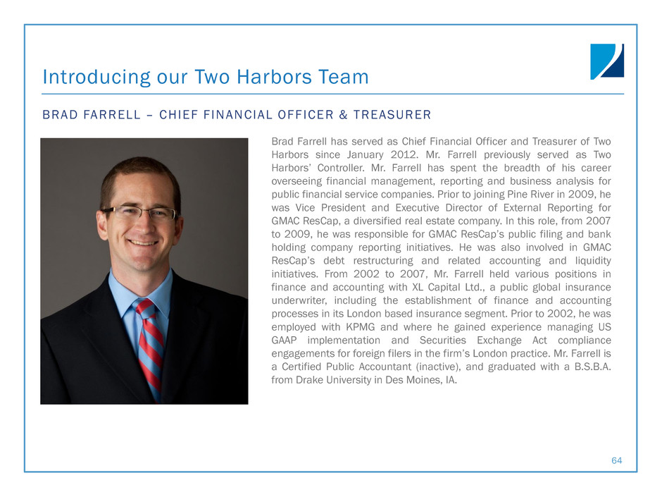 Introducing our Two Harbors Team 64 BRAD FARRELL – CHIEF F INANCIAL OFFICER & TREASURER Brad Farrell has served as Chief Financial Officer and Treasurer of Two Harbors since January 2012. Mr. Farrell previously served as Two Harbors’ Controller. Mr. Farrell has spent the breadth of his career overseeing financial management, reporting and business analysis for public financial service companies. Prior to joining Pine River in 2009, he was Vice President and Executive Director of External Reporting for GMAC ResCap, a diversified real estate company. In this role, from 2007 to 2009, he was responsible for GMAC ResCap’s public filing and bank holding company reporting initiatives. He was also involved in GMAC ResCap’s debt restructuring and related accounting and liquidity initiatives. From 2002 to 2007, Mr. Farrell held various positions in finance and accounting with XL Capital Ltd., a public global insurance underwriter, including the establishment of finance and accounting processes in its London based insurance segment. Prior to 2002, he was employed with KPMG and where he gained experience managing US GAAP implementation and Securities Exchange Act compliance engagements for foreign filers in the firm’s London practice. Mr. Farrell is a Certified Public Accountant (inactive), and graduated with a B.S.B.A. from Drake University in Des Moines, IA.