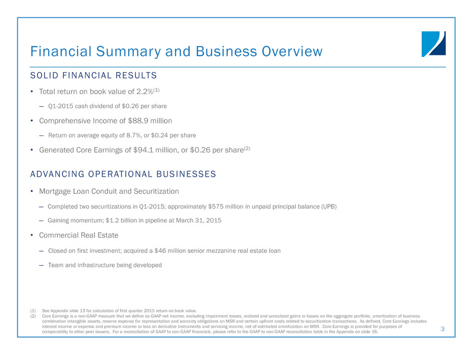 Safe Harbor Statement F O R W A R D - L O O K I N G S T A T E M EN T S This presentation includes “forward-looking statements” within the meaning of the safe harbor provisions of the United States Private Securities Litigation Reform Act of 1995. Actual results may differ from expectations, estimates and projections and, consequently, readers should not rely on these forward-looking statements as predictions of future events. Words such as “expect,” “target,” “assume,” “estimate,” “project,” “budget,” “forecast,” “anticipate,” “intend,” “plan,” “may,” “will,” “could,” “should,” “believe,” “predicts,” “potential,” “continue,” and similar expressions are intended to identify such forward-looking statements. These forward- looking statements involve significant risks and uncertainties that could cause actual results to differ materially from expected results, including, among other things, those described in our Annual Report on Form 10-K for the year ended December 31, 2014, and any subsequent Quarterly Reports on form 10-Q, under the caption “Risk Factors.” Factors that could cause actual results to differ include, but are not limited to: the state of credit markets and general economic conditions; changes in interest rates and the market value of our assets; changes in prepayment rates of mortgages underlying our target assets; the rates of default or decreased recovery on the mortgages underlying our target assets; the occurrence, extent and timing of credit losses within our portfolio; the concentration of credit risks we are exposed to; declines in home prices; our ability to establish, adjust and maintain appropriate hedges for the risks in our portfolio; the availability and cost of our target assets; the availability and cost of financing; changes in the competitive landscape within our industry; our ability to successfully implement new strategies and to diversify our business into new asset classes; our ability to manage various operational risks and costs associated with our business; interruptions in or impairments to our communications and information technology systems; our ability to acquire mortgage loans and successfully securitize the mortgage loans we acquire; our ability to acquire mortgage servicing rights (MSR) and successfully operate our seller-servicer subsidiary and oversee our subservicers; the impact of any deficiencies in the servicing or foreclosure practices of third parties and related delays in the foreclosure process; our exposure to legal and regulatory claims; legislative and regulatory actions affecting our business; the impact of new or modified government mortgage refinance or principal reduction programs; our ability to maintain our REIT qualification; and limitations imposed on our business due to our REIT status and our exempt status under the Investment Company Act of 1940. Readers are cautioned not to place undue reliance upon any forward-looking statements, which speak only as of the date made. Two Harbors does not undertake or accept any obligation to release publicly any updates or revisions to any forward-looking statement to reflect any change in its expectations or any change in events, conditions or circumstances on which any such statement is based. Additional information concerning these and other risk factors is contained in Two Harbors’ most recent filings with the Securities and Exchange Commission (SEC). All subsequent written and oral forward-looking statements concerning Two Harbors or matters attributable to Two Harbors or any person acting on its behalf are expressly qualified in their entirety by the cautionary statements above. This presentation may include industry and market data obtained through research, surveys, and studies conducted by third parties and industry publications. We have not independently verified any such market and industry data from third-party sources. This presentation is provided for discussion purposes only and may not be relied upon as legal or investment advice, nor is it intended to be inclusive of all the risks and uncertainties that should be considered. This presentation does not constitute an offer to purchase or sell any securities, nor shall it be construed to be indicative of the terms of an offer that the parties or their respective affiliates would accept. Readers are advised that the financial information in this presentation is based on company data available at the time of this presentation and, in certain circumstances, may not have been audited by the company’s independent auditors. 2