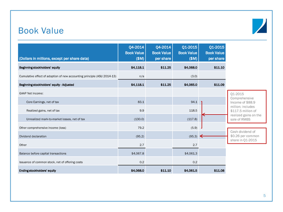 Market and Policy Update MACROECONOMIC ENVIRONMENT & POLICY CONSIDERATIONS • Low, but volatile, interest rate environment – Roughly 60% probability the Federal Reserve will raise rates by at least 25 basis points by December; expected value of 35 basis points(1) • Home price appreciation continues – CoreLogic Home Price Index up 5.9% on rolling 12-month basis(2) • Steady improvement in unemployment – 5.5% in March 2015 versus 6.6% in March 2014 • Actively engaged with a variety of parties in Washington D.C. – Private label securitization market – Servicing standards – GSE risk sharing and housing finance reform – FHFA proposed rulemaking 4 (1) Source: CME Group, as of May 6, 2015. (2) Source: CoreLogic Home Price Index rolling 12-month change in March 2015.