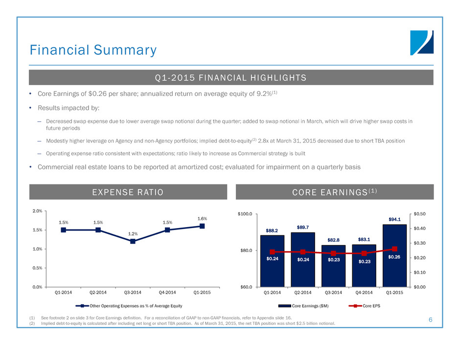 Book Value 5 (Dollars in millions, except per share data) Q4-2014 Book Value ($M) Q4-2014 Book Value per share Q1-2015 Book Value ($M) Q1-2015 Book Value per share Beginning stockholders’ equity $4,118.1 $11.25 $4,068.0 $11.10 Cumulative effect of adoption of new accounting principle (ASU 2014-13) n/a (3.0) Beginning stockholders’ equity - Adjusted $4,118.1 $11.25 $4,065.0 $11.09 GAAP Net Income: Core Earnings, net of tax 83.1 94.1 Realized gains, net of tax 9.9 118.5 Unrealized mark-to-market losses, net of tax (130.0) (117.8) Other comprehensive income (loss) 79.2 (5.9) Dividend declaration (95.2) (95.3) Other 2.7 2.7 Balance before capital transactions $4,067.8 $4,061.3 Issuance of common stock, net of offering costs 0.2 0.2 Ending stockholders’ equity $4,068.0 $11.10 $4,061.5 $11.08 Q1-2015 Comprehensive Income of $88.9 million; includes $117.5 million of realized gains on the sale of RMBS Cash dividend of $0.26 per common share in Q1-2015